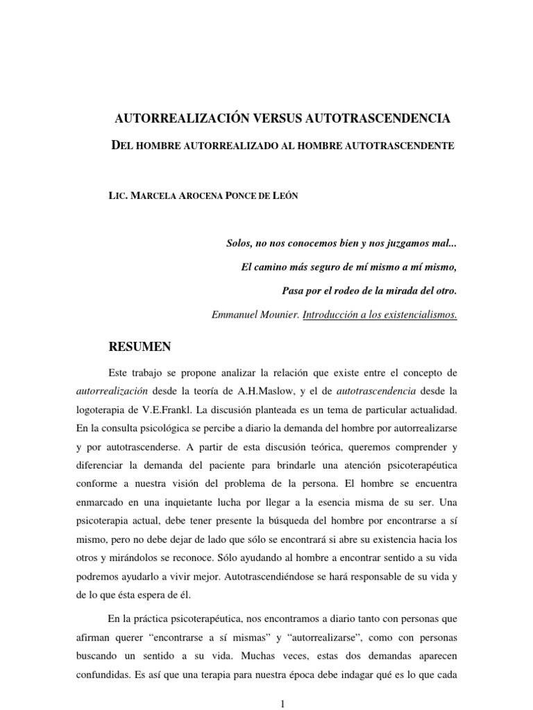 Este trabajo se propone analizar la relacin que existe entre el concepto de autorrealizacin desde la teora de A.H.Maslow, y el de autotrascendencia desde la logoterapia de V.E.Frankl. La discusin planteada es un tema de particular actualidad. En la consulta psicolgica se percibe a diario la demanda del hombre por autorrealizarse y por autotrascenderse. A partir de esta discusin terica, queremos comprender y diferenciar la demanda del paciente para brindarle una atencin psicoteraputica conforme a nuestra visin del problema de la persona. El hombre se encuentra enmarcado en una inquietante lucha por llegar a la esencia misma de su ser. Una psicoterapia actual, debe tener presente la bsqueda del hombre por encontrarse a s mismo, pero no debe dejar de lado que slo se encontrar si abre su existencia hacia los otros y mirndolos se reconoce. Slo ayudando al hombre a encontrar sentido a su vida podremos ayudarlo a vivir mejor. Autotrascendindose se har responsable de su vida y de lo que sta espera de l. En la prctica psicoteraputica, nos encontramos a diario tanto con personas que afirman querer encontrarse a s mismas y autorrealizarse, como con personas buscando un sentido a su vida. Muchas veces, estas dos demandas aparecen confundidas. Es as que una terapia para nuestra poca debe indagar qu es lo que cada 1