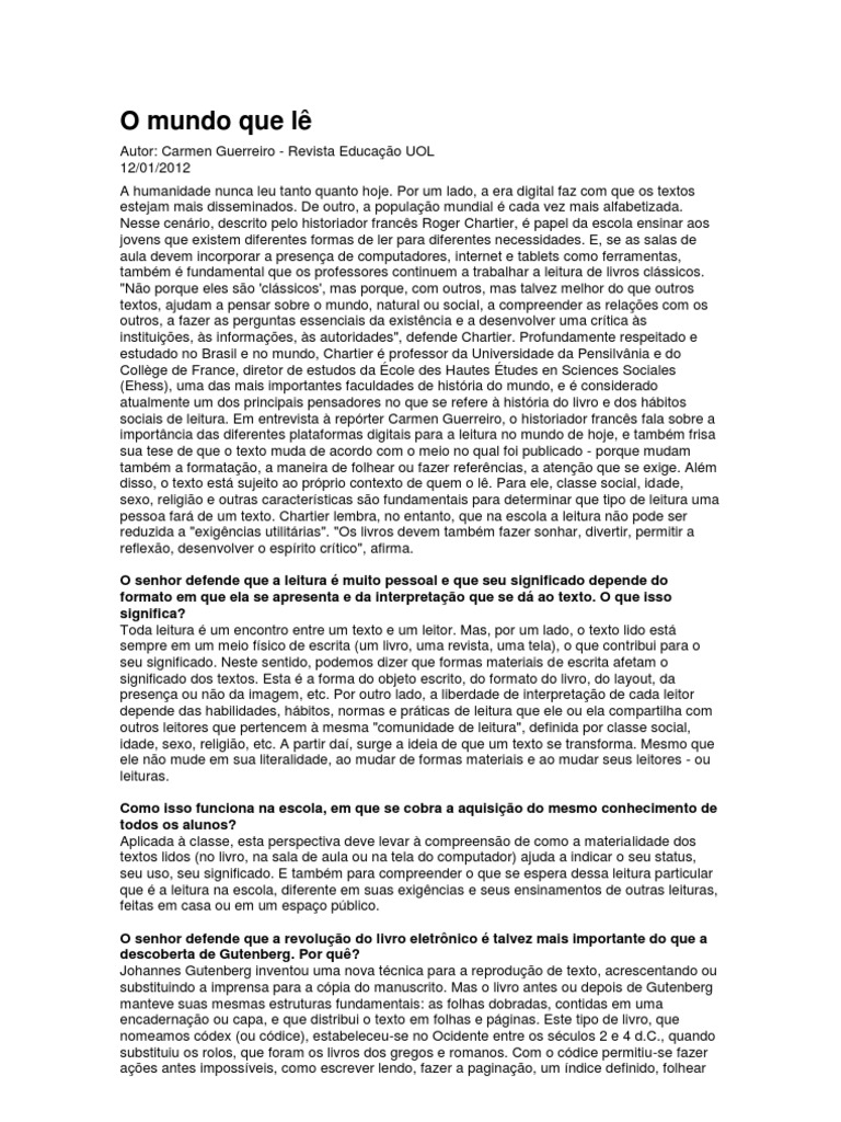 Autor: Carmen Guerreiro - Revista Educao UOL 12/01/2012 A humanidade nunca leu tanto quanto hoje. Por um lado, a era digital faz com que os textos estejam mais disseminados. De outro, a populao mundial cada vez mais alfabetizada. Nesse cenrio, descrito pelo historiador francs Roger Chartier, papel da escola ensinar aos jovens que existem diferentes formas de ler para diferentes necessidades. E, se as salas de aula devem incorporar a presena de computadores, internet e tablets como ferramentas, tambm fundamental que os professores continuem a trabalhar a leitura de livros clssicos. "No porque eles so 'clssicos', mas porque, com outros, mas talvez melhor do que outros textos, ajudam a pensar sobre o mundo, natural ou social, a compreender as relaes com os outros, a fazer as perguntas essenciais da existncia e a desenvolver uma crtica s instituies, s informaes, s autoridades", defende Chartier. Profundamente respeitado e estudado no Brasil e no mundo, Chartier professor da Universidade da Pensilvnia e do Collge de France, diretor de estudos da cole des Hautes tudes en Sciences Sociales (Ehess), uma das mais importantes faculdades de histria do mundo, e considerado atualmente um dos principais pensadores no que se refere histria do livro e dos hbitos sociais de leitura. Em entrevista reprter Carmen Guerreiro, o historiador francs fala sobre a importncia das diferentes plataformas digitais para a leitura no mundo de hoje, e tambm frisa sua tese de que o texto muda de acordo com o meio no qual foi publicado - porque mudam tambm a formatao, a maneira de folhear ou fazer referncias, a ateno que se exige. Alm disso, o texto est sujeito ao prprio contexto de quem o l. Para ele, classe social, idade, sexo, religio e outras caractersticas so fundamentais para determinar que tipo de leitura uma pessoa far de um texto. Chartier lembra, no entanto, que na escola a leitura no pode ser reduzida a "exigncias utilitrias". "Os livros devem tambm fazer sonhar, divertir, permitir a reflexo, desenvolver o esprito crtico", afirma. O senhor defende que a leitura muito pessoal e que seu significado depende do formato em que ela se apresenta e da interpretao que se d ao texto. O que isso significa? Toda leitura um encontro entre um texto e um leitor. Mas, por um lado, o texto lido est sempre em um meio fsico de escrita (um livro, uma revista, uma tela), o que contribui para o seu significado. Neste sentido, podemos dizer que formas materiais de escrita afetam o significado dos textos. Esta a forma do objeto escrito, do formato do livro, do layout, da presena ou no da imagem, etc. Por outro lado, a liberdade de interpretao de cada leitor depende das habilidades, hbitos, normas e prticas de leitura que ele ou ela compartilha com outros leitores que pertencem mesma "comunidade de leitura", definida por classe social, idade, sexo, religio, etc. A partir da, surge a ideia de que um texto se transforma. Mesmo que ele no mude em sua literalidade, ao mudar de formas materiais e ao mudar seus leitores - ou leituras. Como isso funciona na escola, em que se cobra a aquisio do mesmo conhecimento de todos os alunos? Aplicada classe, esta perspectiva deve levar compreenso de como a materialidade dos textos lidos (no livro, na sala de aula ou na tela do computador) ajuda a indicar o seu status, seu uso, seu significado. E tambm para compreender o que se espera dessa leitura particular que a leitura na escola, diferente em suas exigncias e seus ensinamentos de outras leituras, feitas em casa ou em um espao pblico. O senhor defende que a revoluo do livro eletrnico talvez mais importante do que a descoberta de Gutenberg. Por qu? Johannes Gutenberg inventou uma nova tcnica para a reproduo de texto, acrescentando ou substituindo a imprensa para a cpia do manuscrito. Mas o livro antes ou depois de Gutenberg manteve suas mesmas estruturas fundamentais: as folhas dobradas, contidas em uma encadernao ou capa, e que distribui o texto em folhas e pginas. Este tipo de livro, que nomeamos cdex (ou cdice), estabeleceu-se no Ocidente entre os sculos 2 e 4 d.C., quando substituiu os rolos, que foram os livros dos gregos e romanos. Com o cdice permitiu-se fazer aes antes impossveis, como escrever lendo, fazer a paginao, um ndice definido, folhear