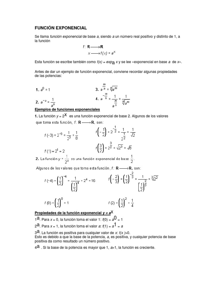 Esta funcin se escribe tambin como f(x) = expa x y se lee exponencial en base a de x. Antes de dar un ejemplo de funcin exponencial, conviene recordar algunas propiedades de las potencias: