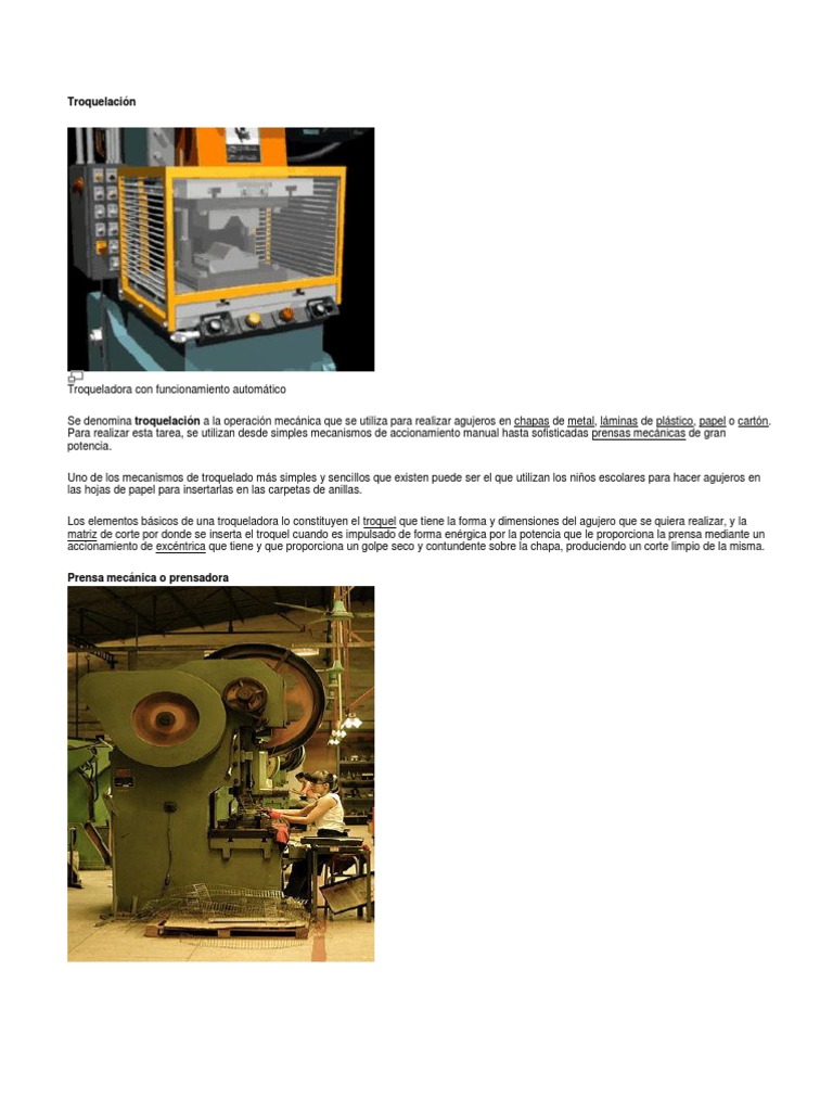 Troqueladora con funcionamiento automtico Se denomina troquelacin a la operacin mecnica que se utiliza para realizar agujeros en chapas de metal, lminas de plstico, papel o cartn. Para realizar esta tarea, se utilizan desde simples mecanismos de accionamiento manual hasta sofisticadas prensas mecnicas de gran potencia. Uno de los mecanismos de troquelado ms simples y sencillos que existen puede ser el que utilizan los nios escolares para hacer agujeros en las hojas de papel para insertarlas en las carpetas de anillas. Los elementos bsicos de una troqueladora lo constituyen el troquel que tiene la forma y dimensiones del agujero que se quiera realizar, y la matriz de corte por donde se inserta el troquel cuando es impulsado de forma enrgica por la potencia que le proporciona la prensa mediante un accionamiento de excntrica que tiene y que proporciona un golpe seco y contundente sobre la chapa, produciendo un corte limpio de la misma. Prensa mecnica o prensadora