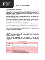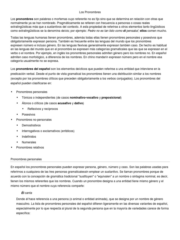 otras que normalmente ya se han nombrado. Pragmticamente se refieren con frecuencia a personas o cosas reales extralingsticas ms que a sustantivos del contexto. A esta propiedad de referirse a otros elementos tanto lingsticos como extralingsticos se la denomina dexis; por ejemplo: Pedro no es tan listo como l pensaba'; ellos comen mucho. Todas las lenguas humanas tienen pronombres, adems todas ellas tienen pronombres personales y posesivos que obligatoriamente expresan persona. Tambin es frecuente entre las lenguas del mundo que los pronombres expresen nmero e incluso gnero. En las lenguas flexivas generalmente expresan tambin caso. De hecho es habitual en las lenguas del mundo que en el pronombre se expresen ms categoras gramaticales que las que se expresan en el verbo o el nombre. Por ejemplo, en ingls los pronombres personales admiten gnero pero los nombres no. En espaol admiten caso morfolgico, a diferencia de los nombres. En chino mandarn expresan nmero pero en el nombre esa categora usualmente no se expresa. Los pronombres del espaol son los elementos decticos que pueden referirse a una entidad que interviene en la predicacin verbal. Desde el punto de vista gramatical los pronombres tienen una distribucin similar a los nombres (excepto por los pronombres clticos que preceden obligatoriamente a los verbos conjugados). Los pronombres del espaol pueden clasificarse en: Pronombres personales Tnicos o independientes (de casos nominativo-vocativo y preposicional) tonos o clticos (de casos acusativo y dativo) Reflexivos y recprocos