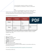 Por ejemplo: Andrea y yo no nos hablamos, donde nos hace referencia a Andrea y a m mismo. Pronombres posesivos En la tradicin gramatical del espaol, se distingue entre adjetivos posesivos y pronombres posesivos (aunque en otras lenguas slo existe un tipo de posesivo, referidos igualmente como pronombres posesivos). En espaol los posesivos se usan para denotar propiedad, cercana o relacin estrecha con una identidad y una persona gramatical. Tienen la misma forma que los adjetivos posesivos, de hecho, el pronombre posesivo se forma con un artculo ms un adjetivo posesivo. Los pronombres posesivos expresan al igual que los pronombres personales gnero y nmero, pero son invariantes segn caso gramatical. Las formas de estos pronombres son: Pronombres posesivos SINGULAR femenino neutro UN POSEEDOR (o singular) la ma lo mo la tuya lo tuyo la suya lo suyo VARIOS POSEEDORES (o plural) la nuestra lo nuestro la vuestra lo vuestro la suya lo suyo