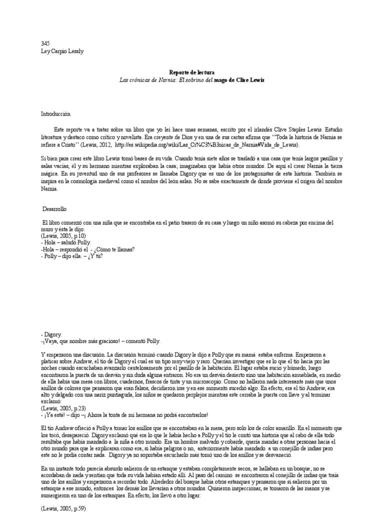 Introduccin Este reporte va a tratar sobre un libro que yo le hace unas semanas, escrito por el irlands Clive Staples Lewis. Estudio literatura y destaco como crtico y novelista. Era creyente de Dios y en una de sus cartas afirma que Toda la historia de Narnia se refiere a Cristo (Lewis, 2012, http://es.wikipedia.org/wiki/Las_Cr%C3%B3nicas_de_Narnia#Vida_de_Lewis). Si bien para crear este libro Lewis tom bases de su vida. Cuando tena siete aos se traslad a una casa que tena largos pasillos y salas vacas, l y su hermano mientras exploraban la casa; imaginaban que haba otros mundos. De aqu el crear Narnia la tierra mgica. En su juventud uno de sus profesores se llamaba Digory que es uno de los protagonistas de esta historia. Tambin se inspira en la cosmologa medieval como el nombre del len aslan. No se sabe exactamente de donde proviene el origen del nombre Narnia. Desarrollo El libro comenz con una nia que se encontraba en el patio trasero de su casa y luego un nio asom su cabeza por encima del muro y sta le dijo: (Lewis, 2005, p.10) - Hola salud Polly. -Hola respondi el - Cmo te llamas? - Polly dijo ella. Y t?