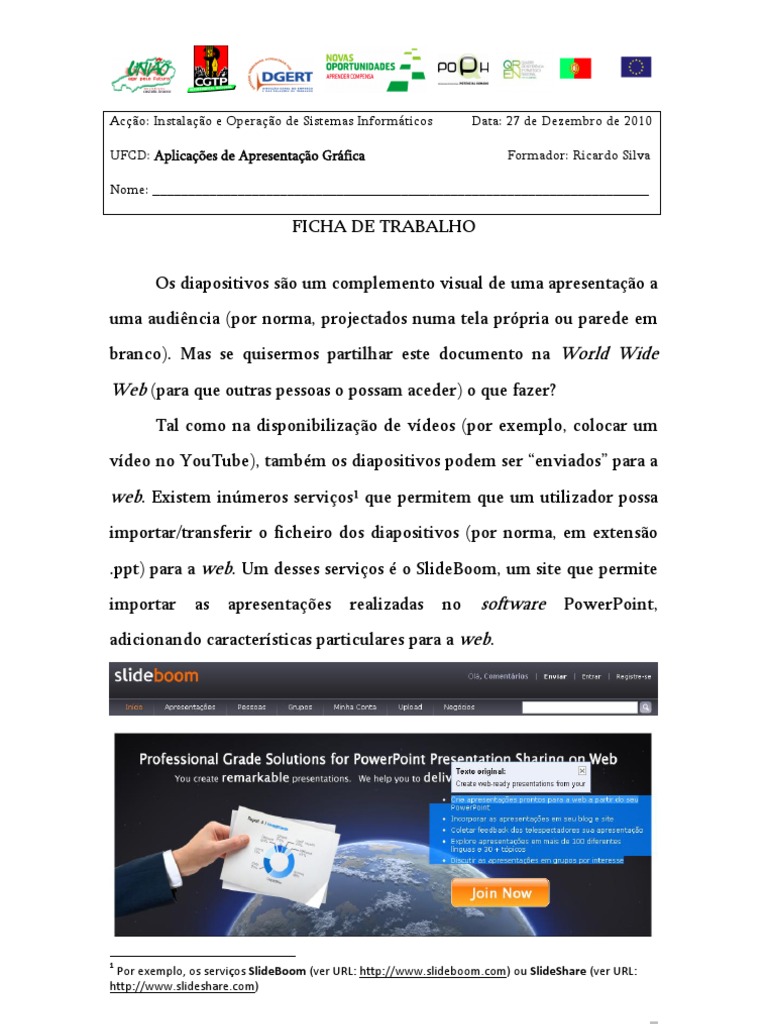 Por exemplo, os servios SlideBoom (ver URL: http://www.slideboom.com) ou SlideShare (ver URL: http://www.slideshare.com)