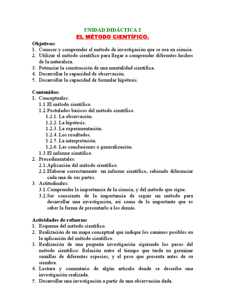 Utilizar el mtodo cientfico para llegar a comprender diferentes hechos de la naturaleza. 3. Potenciar la construccin de una mentalidad cientfica. 4. Desarrollar la capacidad de observacin. 5. Desarrollar la capacidad de formular hiptesis. Contenidos: 1. Conceptuales: 1.1. El mtodo cientfico. 1.2. Postulados bsicos del mtodo cientfico. 1.2.1. La observacin. 1.2.2. La hiptesis. 1.2.3. La experimentacin. 1.2.4. Los resultados. 1.2.5. La interpretacin. 1.2.6. Las conclusiones o generalizacin. 1.3. El informe cientfico. 2. Procedimentales: 2.1. Aplicacin del mtodo cientfico. 2.2. Elaborar correctamente un informe cientfico, sabiendo diferenciar cada una de sus partes. 3. Actitudinales: 3.1. Comprender la importancia de la ciencia, y del mtodo que sigue. 3.2. Ser consciente de la importancia de seguir un mtodo para desarrollar una investigacin, as como de lo importante que es saber la forma de presentarlo a los dems. Actividades de refuerzo: 1. Esquema del mtodo cientfico. 2. Realizacin de un mapa conceptual que indique los caminos posibles en la aplicacin del mtodo cientfico. 3. Realizacin de una pequea investigacin siguiendo los pasos del mtodo cientfico: Relacin entre el tiempo que tarda en germinar semillas de diferentes especies, y el peso que presenta antes de su siembra. 4. Lectura y comentario de algn artculo donde se describa una investigacin realizada. 5. Desarrollar una investigacin a partir de una observacin dada.