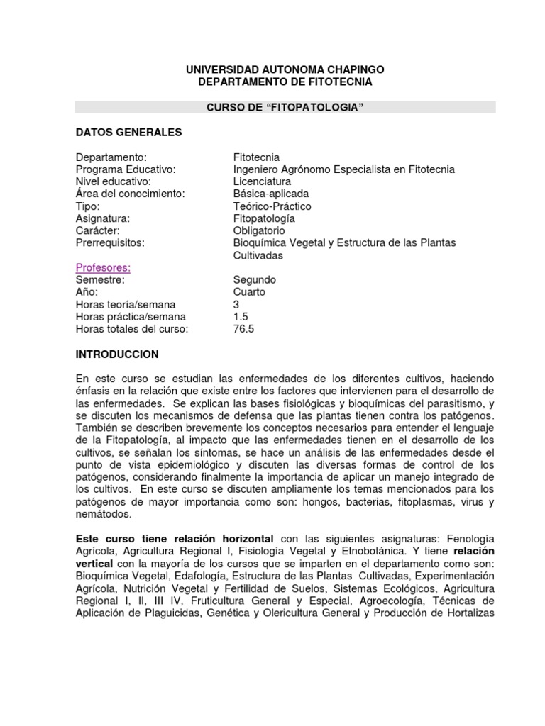 del conocimiento: Tipo: Asignatura: Carcter: Prerrequisitos: Profesores: Semestre: Ao: Horas teora/semana Horas prctica/semana Horas totales del curso: INTRODUCCION En este curso se estudian las enfermedades de los diferentes cultivos, haciendo nfasis en la relacin que existe entre los factores que intervienen para el desarrollo de las enfermedades. Se explican las bases fisiolgicas y bioqumicas del parasitismo, y se discuten los mecanismos de defensa que las plantas tienen contra los patgenos. Tambin se describen brevemente los conceptos necesarios para entender el lenguaje de la Fitopatologa, al impacto que las enfermedades tienen en el desarrollo de los cultivos, se sealan los sntomas, se hace un anlisis de las enfermedades desde el punto de vista epidemiolgico y discuten las diversas formas de control de los patgenos, considerando finalmente la importancia de aplicar un manejo integrado de los cultivos. En este curso se discuten ampliamente los temas mencionados para los patgenos de mayor importancia como son: hongos, bacterias, fitoplasmas, virus y nemtodos. Este curso tiene relacin horizontal con las siguientes asignaturas: Fenologa Agrcola, Agricultura Regional I, Fisiologa Vegetal y Etnobotnica. Y tiene relacin vertical con la mayora de los cursos que se imparten en el departamento como son: Bioqumica Vegetal, Edafologa, Estructura de las Plantas Cultivadas, Experimentacin Agrcola, Nutricin Vegetal y Fertilidad de Suelos, Sistemas Ecolgicos, Agricultura Regional I, II, III IV, Fruticultura General y Especial, Agroecologa, Tcnicas de Aplicacin de Plaguicidas, Gentica y Olericultura General y Produccin de Hortalizas Fitotecnia Ingeniero Agrnomo Especialista en Fitotecnia Licenciatura Bsica-aplicada Terico-Prctico Fitopatologa Obligatorio Bioqumica Vegetal y Estructura de las Plantas Cultivadas Segundo Cuarto 3 1.5 76.5