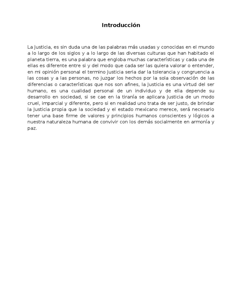 La Justicia, es sin duda una de las palabras ms usadas y conocidas en el mundo a lo largo de los siglos y a lo largo de las diversas culturas que han habitado el planeta tierra, es una palabra que engloba muchas caractersticas y cada una de ellas es diferente entre si y del modo que cada ser las quiera valorar o entender, en mi opinin personal el termino Justicia seria dar la tolerancia y congruencia a las cosas y a las personas, no juzgar los hechos por la sola observacin de las diferencias o caractersticas que nos son afines, la Justicia es una virtud del ser humano, es una cualidad personal de un individuo y de ella depende su desarrollo en sociedad, si se cae en la tirana se aplicara Justicia de un modo cruel, imparcial y diferente, pero si en realidad uno trata de ser justo, de brindar la Justicia propia que la sociedad y el estado mexicano merece, ser necesario tener una base firme de valores y principios humanos conscientes y lgicos a nuestra naturaleza humana de convivir con los dems socialmente en armona y paz.