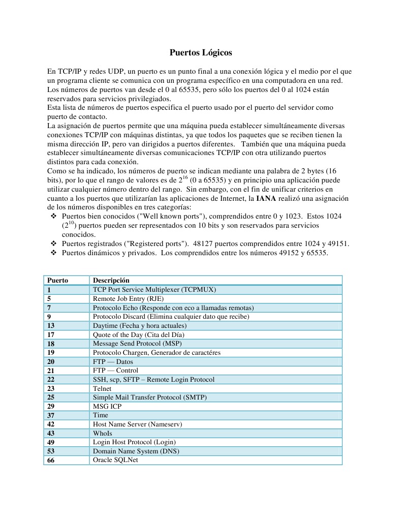 En TCP/IP y redes UDP, un puerto es un punto final a una conexin lgica y el medio por el que un programa cliente se comunica con un programa especfico en una computadora en una red. Los nmeros de puertos van desde el 0 al 65535, pero slo los puertos del 0 al 1024 estn reservados para servicios privilegiados. Esta lista de nmeros de puertos especifica el puerto usado por el puerto del servidor como puerto de contacto. La asignacin de puertos permite que una mquina pueda establecer simultneamente diversas conexiones TCP/IP con mquinas distintas, ya que todos los paquetes que se reciben tienen la misma direccin IP, pero van dirigidos a puertos diferentes. Tambin que una mquina pueda establecer simultneamente diversas comunicaciones TCP/IP con otra utilizando puertos distintos para cada conexin. Como se ha indicado, los nmeros de puerto se indican mediante una palabra de 2 bytes (16 bits), por lo que el rango de valores es de 216 (0 a 65535) y en principio una aplicacin puede utilizar cualquier nmero dentro del rango. Sin embargo, con el fin de unificar criterios en cuanto a los puertos que utilizaran las aplicaciones de Internet, la IANA realiz una asignacin de los nmeros disponibles en tres categoras: Puertos bien conocidos ("Well known ports"), comprendidos entre 0 y 1023. Estos 1024 (210) puertos pueden ser representados con 10 bits y son reservados para servicios conocidos. Puertos registrados ("Registered ports"). 48127 puertos comprendidos entre 1024 y 49151. Puertos dinmicos y privados. Los comprendidos entre los nmeros 49152 y 65535.