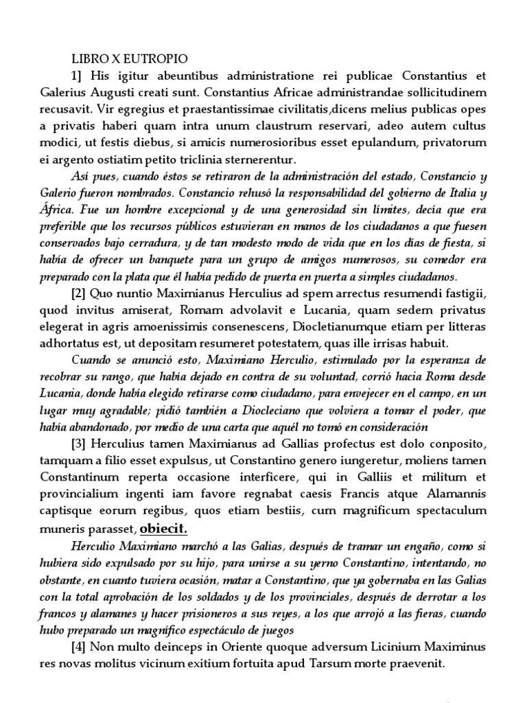 Constantius Africae administrandae sollicitudinem recusavit. Vir egregius et praestantissimae civilitatis,dicens melius publicas opes a privatis haberi quam intra unum claustrum reservari, adeo autem cultus modici, ut festis diebus, si amicis numerosioribus esset epulandum, privatorum ei argento ostiatim petito triclinia sternerentur. As pues, cuando stos se retiraron de la administracin del estado, Constancio y Galerio fueron nombrados. Constancio rehus la responsabilidad del gobierno de Italia y frica. Fue un hombre excepcional y de una generosidad sin lmites, deca que era preferible que los recursos pblicos estuvieran en manos de los ciudadanos a que fuesen conservados bajo cerradura, y de tan modesto modo de vida que en los das de fiesta, si haba de ofrecer un banquete para un grupo de amigos numerosos, su comedor era preparado con la plata que l haba pedido de puerta en puerta a simples ciudadanos. [2] Quo nuntio Maximianus Herculius ad spem arrectus resumendi fastigii, quod invitus amiserat, Romam advolavit e Lucania, quam sedem privatus elegerat in agris amoenissimis consenescens, Diocletianumque etiam per litteras adhortatus est, ut depositam resumeret potestatem, quas ille irrisas habuit. Cuando se anunci esto, Maximiano Herculio, estimulado por la esperanza de recobrar su rango, que haba dejado en contra de su voluntad, corri hacia Roma desde Lucania, donde haba elegido retirarse como ciudadano, para envejecer en el campo, en un lugar muy agradable; pidi tambin a Diocleciano que volviera a tomar el poder, que haba abandonado, por medio de una carta que aqul no tom en consideracin [3] Herculius tamen Maximianus ad Gallias profectus est dolo conposito, tamquam a filio esset expulsus, ut Constantino genero iungeretur, moliens tamen Constantinum reperta occasione interficere, qui in Galliis et militum et provincialium ingenti iam favore regnabat caesis Francis atque Alamannis captisque eorum regibus, quos etiam bestiis, cum magnificum spectaculum muneris parasset, obiecit. Herculio Maximiano march a las Galias, despus de tramar un engao, como si hubiera sido expulsado por su hijo, para unirse a su yerno Constantino, intentando, no obstante, en cuanto tuviera ocasin, matar a Constantino, que ya gobernaba en las Galias con la total aprobacin de los soldados y de los provinciales, despus de derrotar a los francos y alamanes y hacer prisioneros a sus reyes, a los que arroj a las fieras, cuando hubo preparado un magnfico espectculo de juegos [4] Non multo deinceps in Oriente quoque adversum Licinium Maximinus res novas molitus vicinum exitium fortuita apud Tarsum morte praevenit.