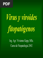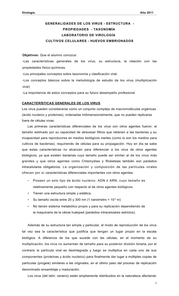 Objetivos: Que el alumno conozca: -Las caractersticas generales de los virus, su estructura, la relacin con las propiedades fsico-qumicas. -Los principales conceptos sobre taxonoma y clasificacin viral. -Los conceptos bsicos sobre la metodologa de estudio de los virus (multiplicacin viral) -La importancia de estos conceptos para su futuro desempeo profesional CARACTERSTICAS GENERALES DE LOS VIRUS Los virus pueden considerarse como un conjunto complejo de macromolculas orgnicas (cido nucleico y protenas), ordenadas tridimensionalmente, que no pueden replicarse fuera de clulas vivas. Las primeras caractersticas diferenciales de los virus con otros agentes fueron: el tamao estimado por su capacidad de atravesar filtros que retienen a las bacterias y su incapacidad para reproducirse en medios biolgicos inertes (como lo son los medios para cultivos de bacterias), requiriendo de clulas para su propagacin. Hoy en da se sabe que estas caractersticas no alcanzan para diferenciar a los virus de otros agentes biolgicos, ya que existen bacterias cuyo tamao puede ser similar al de los virus ms grandes y que otros agentes como Chlamydias y Ricketsias tambin son parsitos intracelulares obligatorios. La organizacin y composicin de las partculas virales ofrecen por s caractersticas diferenciales importantes con otros agentes: