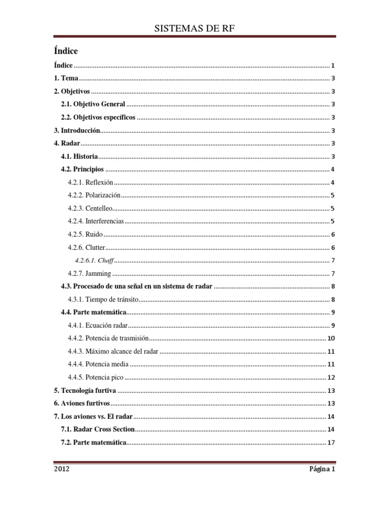 ndice .................................................................................................................................................. 1 1. Tema ............................................................................................................................................... 3 2. Objetivos ........................................................................................................................................ 3 2.1. Objetivo General .................................................................................................................... 3 2.2. Objetivos especficos .............................................................................................................. 3 3. Introduccin................................................................................................................................... 3 4. Radar .............................................................................................................................................. 3 4.1. Historia .................................................................................................................................... 3 4.2. Principios ................................................................................................................................ 4 4.2.1. Reflexin ........................................................................................................................... 4 4.2.2. Polarizacin ....................................................................................................................... 5 4.2.3. Centelleo............................................................................................................................ 5 4.2.4. Interferencias ..................................................................................................................... 5 4.2.5. Ruido ................................................................................................................................. 6 4.2.6. Clutter ................................................................................................................................ 6 4.2.6.1. Chaff ........................................................................................................................... 7 4.2.7. Jamming ............................................................................................................................ 7 4.3. Procesado de una seal en un sistema de radar .................................................................. 8 4.3.1. Tiempo de trnsito............................................................................................................. 8 4.4. Parte matemtica.................................................................................................................... 9 4.4.1. Ecuacin radar ................................................................................................................... 9 4.4.2. Potencia de trasmisin ..................................................................................................... 10 4.4.3. Mximo alcance del radar ............................................................................................... 11 4.4.4. Potencia media ................................................................................................................ 11 4.4.5. Potencia pico ................................................................................................................... 12 5. Tecnologa furtiva ....................................................................................................................... 13 6. Aviones furtivos ........................................................................................................................... 13 7. Los aviones vs. El radar .............................................................................................................. 14 7.1. Radar Cross Section ............................................................................................................. 14 7.2. Parte matemtica.................................................................................................................. 17