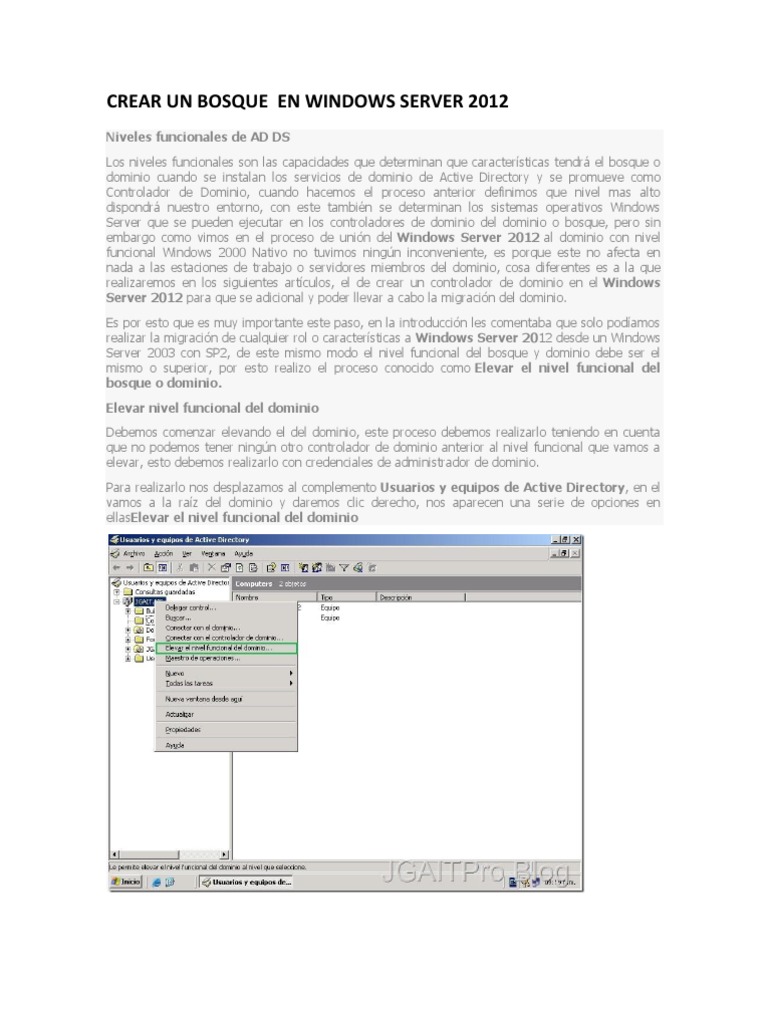 Niveles funcionales de AD DS Los niveles funcionales son las capacidades que determinan que caractersticas tendr el bosque o dominio cuando se instalan los servicios de dominio de Active Directory y se promueve como Controlador de Dominio, cuando hacemos el proceso anterior definimos que nivel mas alto dispondr nuestro entorno, con este tambin se determinan los sistemas operativos Windows Server que se pueden ejecutar en los controladores de dominio del dominio o bosque, pero sin embargo como vimos en el proceso de unin del Windows Server 2012 al dominio con nivel funcional Windows 2000 Nativo no tuvimos ningn inconveniente, es porque este no afecta en nada a las estaciones de trabajo o servidores miembros del dominio, cosa diferentes es a la que realizaremos en los siguientes artculos, el de crear un controlador de dominio en el Windows Server 2012 para que se adicional y poder llevar a cabo la migracin del dominio. Es por esto que es muy importante este paso, en la introduccin les comentaba que solo podamos realizar la migracin de cualquier rol o caractersticas a Windows Server 2012 desde un Windows Server 2003 con SP2, de este mismo modo el nivel funcional del bosque y dominio debe ser el mismo o superior, por esto realizo el proceso conocido como Elevar el nivel funcional del bosque o dominio. Elevar nivel funcional del dominio Debemos comenzar elevando el del dominio, este proceso debemos realizarlo teniendo en cuenta que no podemos tener ningn otro controlador de dominio anterior al nivel funcional que vamos a elevar, esto debemos realizarlo con credenciales de administrador de dominio. Para realizarlo nos desplazamos al complemento Usuarios y equipos de Active Directory, en el vamos a la raz del dominio y daremos clic derecho, nos aparecen una serie de opciones en ellasElevar el nivel funcional del dominio