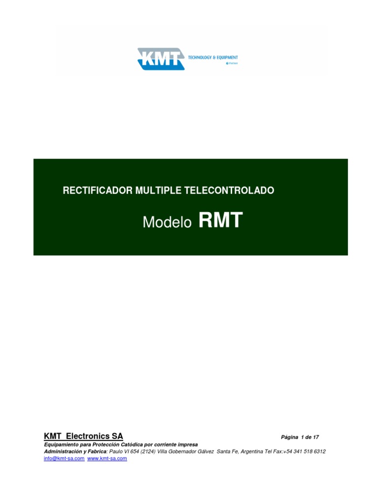 Los Rectificadores Mltiples Telecontrolados, Kmt Electronics, son rectificadores de 4 generacin desarrollados para aplicaciones en Proteccin Catdica por corriente impresa, que permiten una operacin utilizando avanzados criterios y normativas adoptadas por NACE y estn diseados para cubrir con la mayora de los requerimientos en aplicaciones de OIL & GAS. Este equipo posee fuentes Switching completamente Digitales y pueden ser operados LOCALMENTE mediante un panel de operacin ubicado en el equipo, o mediante un vnculo de comunicacin, en forma REMOTA (control y monitoreo) a travs de nuestro portal de datos SmartMonitor, accediendo a nuestro sitio [Link] ingresando por Gestin Remota o desde un centro de control con nuestro paquete de escritorio SmartMonitorDesk. El producto es fabricado en dos versiones diferentes: versin standard refriferados en aire (NEMA 3R / IP33) y refregerados en aceite (NEMA 4X / IP64 ) o para reas clasificadas Cl 1 - Div 2
