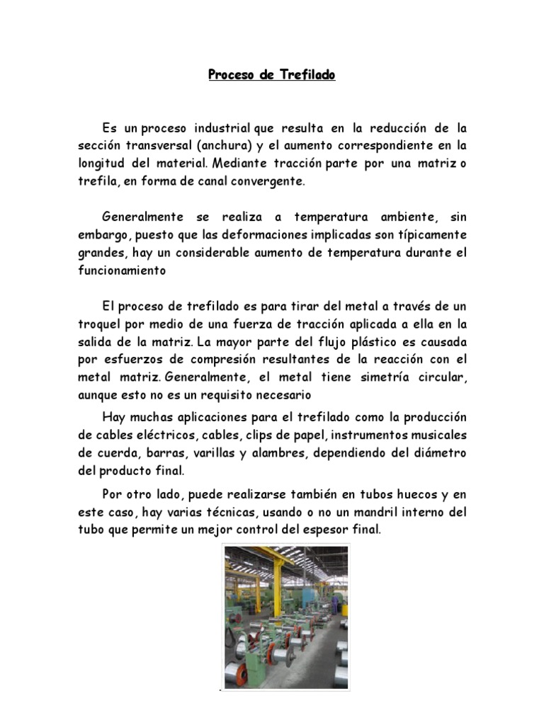 Es un proceso industrial que resulta en la reduccin de la seccin transversal (anchura) y el aumento correspondiente en la longitud del material. Mediante traccin parte por una matriz o trefila, en forma de canal convergente. Generalmente se realiza a temperatura ambiente, sin embargo, puesto que las deformaciones implicadas son tpicamente grandes, hay un considerable aumento de temperatura durante el funcionamiento El proceso de trefilado es para tirar del metal a travs de un troquel por medio de una fuerza de traccin aplicada a ella en la salida de la matriz. La mayor parte del flujo plstico es causada por esfuerzos de compresin resultantes de la reaccin con el metal matriz. Generalmente, el metal tiene simetra circular, aunque esto no es un requisito necesario Hay muchas aplicaciones para el trefilado como la produccin de cables elctricos, cables, clips de papel, instrumentos musicales de cuerda, barras, varillas y alambres, dependiendo del dimetro del producto final. Por otro lado, puede realizarse tambin en tubos huecos y en este caso, hay varias tcnicas, usando o no un mandril interno del tubo que permite un mejor control del espesor final.