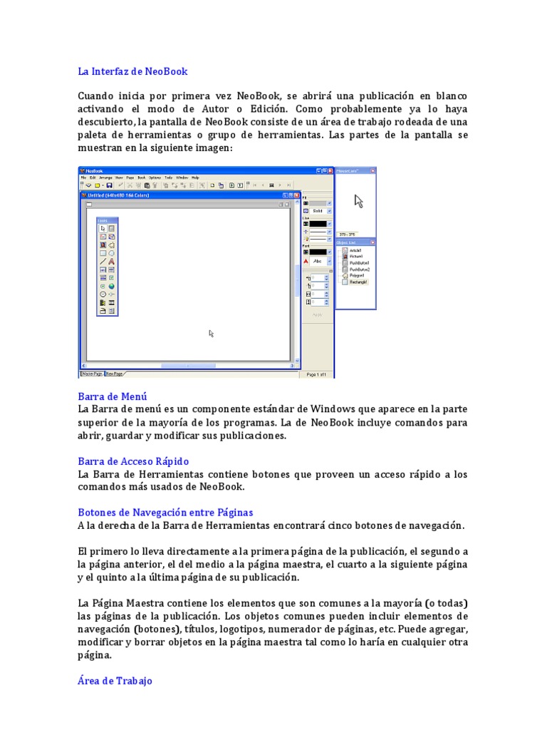 Barra de Men La Barra de men es un componente estndar de Windows que aparece en la parte superior de la mayora de los programas. La de NeoBook incluye comandos para abrir, guardar y modificar sus publicaciones. Barra de Acceso Rpido La Barra de Herramientas contiene botones que proveen un acceso rpido a los comandos ms usados de NeoBook. Botones de Navegacin entre Pginas A la derecha de la Barra de Herramientas encontrar cinco botones de navegacin. El primero lo lleva directamente a la primera pgina de la publicacin, el segundo a la pgina anterior, el del medio a la pgina maestra, el cuarto a la siguiente pgina y el quinto a la ltima pgina de su publicacin. La Pgina Maestra contiene los elementos que son comunes a la mayora (o todas) las pginas de la publicacin. Los objetos comunes pueden incluir elementos de navegacin (botones), ttulos, logotipos, numerador de pginas, etc. Puede agregar, modificar y borrar objetos en la pgina maestra tal como lo hara en cualquier otra pgina. rea de Trabajo