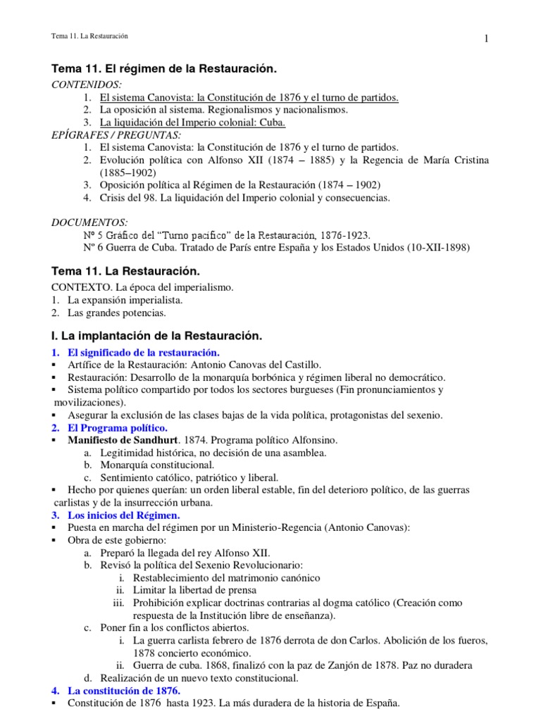 Restauración: Desarrollo de la monarquía borbónica y régimen liberal no democrático.