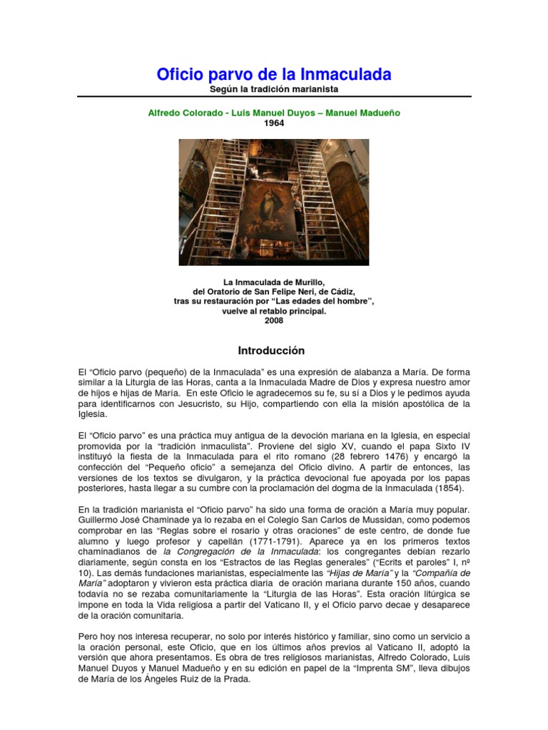 El Oficio parvo (pequeo) de la Inmaculada es una expresin de alabanza a Mara. De forma similar a la Liturgia de las Horas, canta a la Inmaculada Madre de Dios y expresa nuestro amor de hijos e hijas de Mara. En este Oficio le agradecemos su fe, su s a Dios y le pedimos ayuda para identificarnos con Jesucristo, su Hijo, compartiendo con ella la misin apostlica de la Iglesia. El Oficio parvo es una prctica muy antigua de la devocin mariana en la Iglesia, en especial promovida por la tradicin inmaculista. Proviene del siglo XV, cuando el papa Sixto IV instituy la fiesta de la Inmaculada para el rito romano (28 febrero 1476) y encarg la confeccin del Pequeo oficio a semejanza del Oficio divino. A partir de entonces, las versiones de los textos se divulgaron, y la prctica devocional fue apoyada por los papas posteriores, hasta llegar a su cumbre con la proclamacin del dogma de la Inmaculada (1854). En la tradicin marianista el Oficio parvo ha sido una forma de oracin a Mara muy popular. Guillermo Jos Chaminade ya lo rezaba en el Colegio San Carlos de Mussidan, como podemos comprobar en las Reglas sobre el rosario y otras oraciones de este centro, de donde fue alumno y luego profesor y capelln (1771-1791). Aparece ya en los primeros textos chaminadianos de la Congregacin de la Inmaculada: los congregantes deban rezarlo diariamente, segn consta en los Estractos de las Reglas generales (Ecrits et paroles I, n 10). Las dems fundaciones marianistas, especialmente las Hijas de Mara y la Compaa de Mara adoptaron y vivieron esta prctica diaria de oracin mariana durante 150 aos, cuando todava no se rezaba comunitariamente la Liturgia de las Horas. Esta oracin litrgica se impone en toda la Vida religiosa a partir del Vaticano II, y el Oficio parvo decae y desaparece de la oracin comunitaria. Pero hoy nos interesa recuperar, no solo por inters histrico y familiar, sino como un servicio a la oracin personal, este Oficio, que en los ltimos aos previos al Vaticano II, adopt la versin que ahora presentamos. Es obra de tres religiosos marianistas, Alfredo Colorado, Luis Manuel Duyos y Manuel Madueo y en su edicin en papel de la Imprenta SM, lleva dibujos de Mara de los ngeles Ruiz de la Prada.