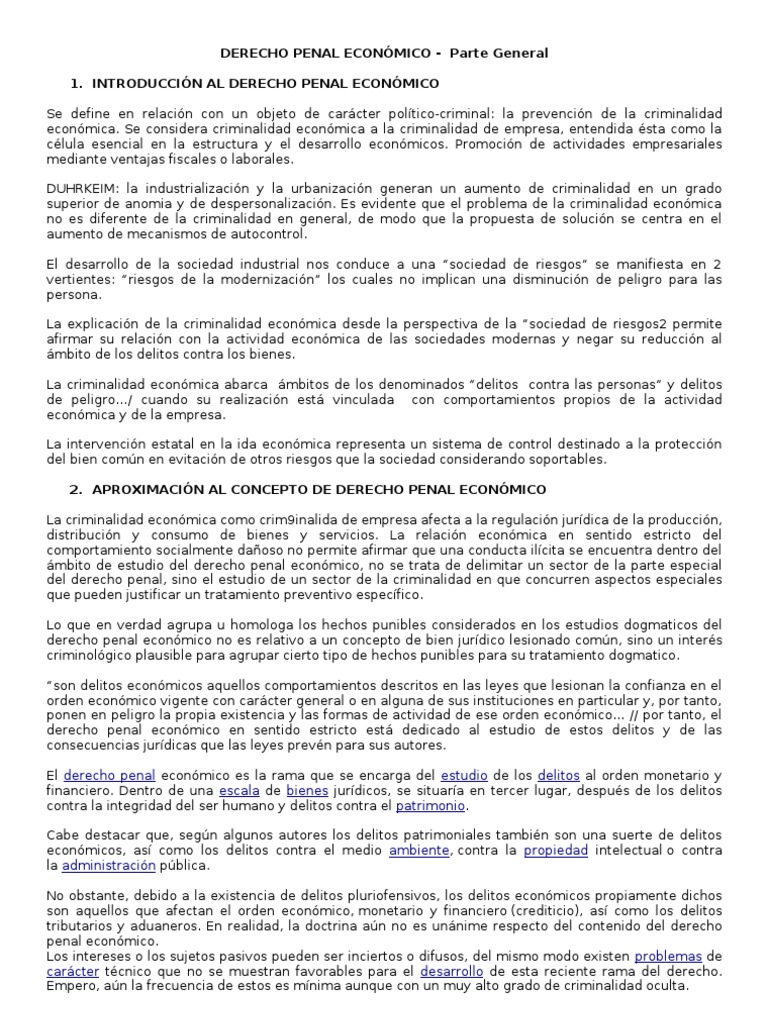 INTRODUCCIN AL DERECHO PENAL ECONMICO Se define en relacin con un objeto de carcter poltico-criminal: la prevencin de la criminalidad econmica. Se considera criminalidad econmica a la criminalidad de empresa, entendida sta como la clula esencial en la estructura y el desarrollo econmicos. Promocin de actividades empresariales mediante ventajas fiscales o laborales. DUHRKEIM: la industrializacin y la urbanizacin generan un aumento de criminalidad en un grado superior de anomia y de despersonalizacin. Es evidente que el problema de la criminalidad econmica no es diferente de la criminalidad en general, de modo que la propuesta de solucin se centra en el aumento de mecanismos de autocontrol. El desarrollo de la sociedad industrial nos conduce a una sociedad de riesgos se manifiesta en 2 vertientes: riesgos de la modernizacin los cuales no implican una disminucin de peligro para las persona. La explicacin de la criminalidad econmica desde la perspectiva de la sociedad de riesgos2 permite afirmar su relacin con la actividad econmica de las sociedades modernas y negar su reduccin al mbito de los delitos contra los bienes. La criminalidad econmica abarca mbitos de los denominados delitos contra las personas y delitos de peligro/ cuando su realizacin est vinculada con comportamientos propios de la actividad econmica y de la empresa. La intervencin estatal en la ida econmica representa un sistema de control destinado a la proteccin del bien comn en evitacin de otros riesgos que la sociedad considerando soportables. 2. APROXIMACIN AL CONCEPTO DE DERECHO PENAL ECONMICO La criminalidad econmica como crim9inalida de empresa afecta a la regulacin jurdica de la produccin, distribucin y consumo de bienes y servicios. La relacin econmica en sentido estricto del comportamiento socialmente daoso no permite afirmar que una conducta ilcita se encuentra dentro del mbito de estudio del derecho penal econmico, no se trata de delimitar un sector de la parte especial del derecho penal, sino el estudio de un sector de la criminalidad en que concurren aspectos especiales que pueden justificar un tratamiento preventivo especfico. Lo que en verdad agrupa u homologa los hechos punibles considerados en los estudios dogmaticos del derecho penal econmico no es relativo a un concepto de bien jurdico lesionado comn, sino un inters criminolgico plausible para agrupar cierto tipo de hechos punibles para su tratamiento dogmatico. son delitos econmicos aquellos comportamientos descritos en las leyes que lesionan la confianza en el orden econmico vigente con carcter general o en alguna de sus instituciones en particular y, por tanto, ponen en peligro la propia existencia y las formas de actividad de ese orden econmico // por tanto, el derecho penal econmico en sentido estricto est dedicado al estudio de estos delitos y de las consecuencias jurdicas que las leyes prevn para sus autores. El derecho penal econmico es la rama que se encarga del estudio de los delitos al orden monetario y financiero. Dentro de una escala de bienes jurdicos, se situara en tercer lugar, despus de los delitos contra la integridad del ser humano y delitos contra el patrimonio. Cabe destacar que, segn algunos autores los delitos patrimoniales tambin son una suerte de delitos econmicos, as como los delitos contra el medio ambiente, contra la propiedad intelectual o contra la administracin pblica. No obstante, debido a la existencia de delitos pluriofensivos, los delitos econmicos propiamente dichos son aquellos que afectan el orden econmico, monetario y financiero (crediticio), as como los delitos tributarios y aduaneros. En realidad, la doctrina an no es unnime respecto del contenido del derecho penal econmico. Los intereses o los sujetos pasivos pueden ser inciertos o difusos, del mismo modo existen problemas de carcter tcnico que no se muestran favorables para el desarrollo de esta reciente rama del derecho. Empero, an la frecuencia de estos es mnima aunque con un muy alto grado de criminalidad oculta.