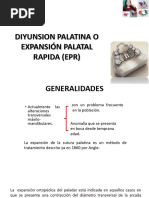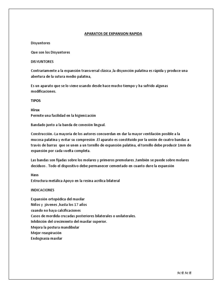 Contraindicaciones Pacientes poco colaboradores Dolicocefalo Mordida abierta anterior EFECTOS ESQUELETICOS Y DENTALES Los efectos ortopdicos del disyuntor se manifiestan en distintos planos: horizontal, frontal y sagital. Plano horizontal se sucede una apertura en abanico de la sutura media del paladar determinada por la mayor resistencia de la zona posterior. Plano frontal, los dos maxilares divergen hacia abajo en un movimiento piramidal En esta rotacin hacia fuera se sucede, igualmente, el descenso de la bveda palatina, gracias a la cual se realiza el aumento de la capacidad ventilatoria nasal Plano sagital se nota un avance del punto A relacionado con el aumento de la base maxilar subsiguiente con la curacin de la apertura en abanico producida por la expansin Despus de los primeros das de activacin, se puede observar la presencia de un diastema interincisal que es signo evidente de la presencia de la disyuncin. Se utiliza un aparto en cuyo centro hay un tornillo tipo hyrax, bandas de los premolares y molares Alambre 1mm festoneando la cara palatina de los molares y premolaresSoldar. Activacin 2-3 veces al da, 3 vueltas Debe ser en una semana maana y tarde Al tercer da se produce diastemas temporal Si no se produce diastema es seal que la fuerza esta sobre los dientes hay que detene la a Controles RX, oclusales Mantencin 6 meses., hasta que la sutura se consolide. Activacin La activacin del dispositivo es hecha directamente en la boca al ritmo de 2 vueltas por da. Tenemos el habito de hacer de vuelta cada 5 minutos durante 20 minutos por la maana y otro tanto en la noche antes de acostarse. Es aconsejable examinar al paciente una vez por semana durante la expansin que puede durar entre 20 a 30 das