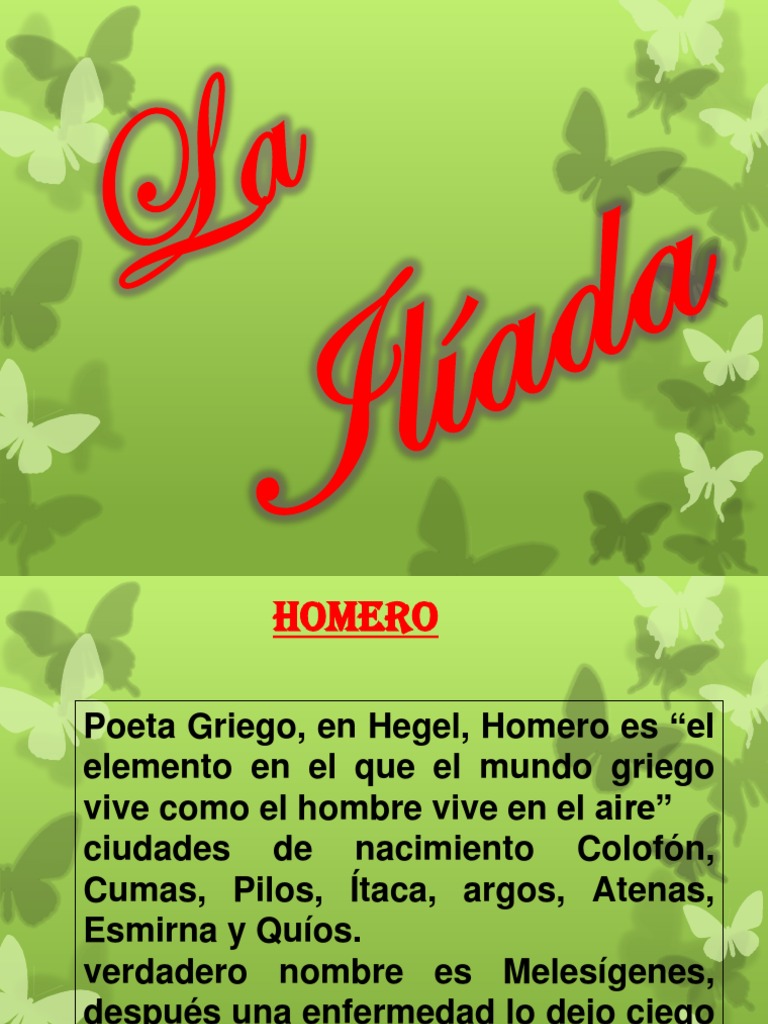 Poeta Griego, en Hegel, Homero es el elemento en el que el mundo griego vive como el hombre vive en el aire ciudades de nacimiento Colofn, Cumas, Pilos, taca, argos, Atenas, Esmirna y Quos. verdadero nombre es Melesgenes, despus una enfermedad lo dejo ciego y ah paso a llamarse homero.