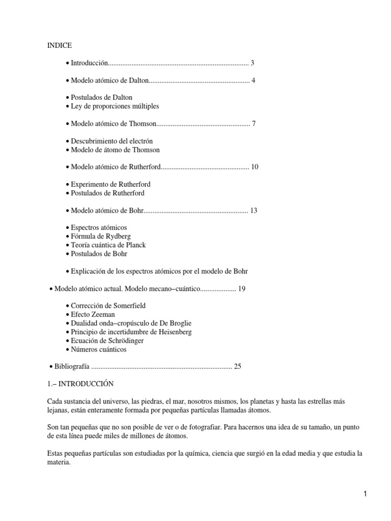 ..... 7 Descubrimiento del electrn Modelo de tomo de Thomson Modelo atmico de Rutherford................................................. 10 Experimento de Rutherford Postulados de Rutherford Modelo atmico de Bohr.......................................................... 13 Espectros atmicos Frmula de Rydberg Teora cuntica de Planck Postulados de Bohr Explicacin de los espectros atmicos por el modelo de Bohr Modelo atmico actual. Modelo mecanocuntico.................... 19 Correccin de Somerfield Efecto Zeeman Dualidad ondacropsculo de De Broglie Principio de incertidumbre de Heisenberg Ecuacin de Schrdinger Nmeros cunticos Bibliografa .............................................................................. 25 1. INTRODUCCIN Cada sustancia del universo, las piedras, el mar, nosotros mismos, los planetas y hasta las estrellas ms lejanas, estn enteramente formada por pequeas partculas llamadas tomos. Son tan pequeas que no son posible de ver o de fotografiar. Para hacernos una idea de su tamao, un punto de esta lnea puede miles de millones de tomos. Estas pequeas partculas son estudiadas por la qumica, ciencia que surgi en la edad media y que estudia la materia.