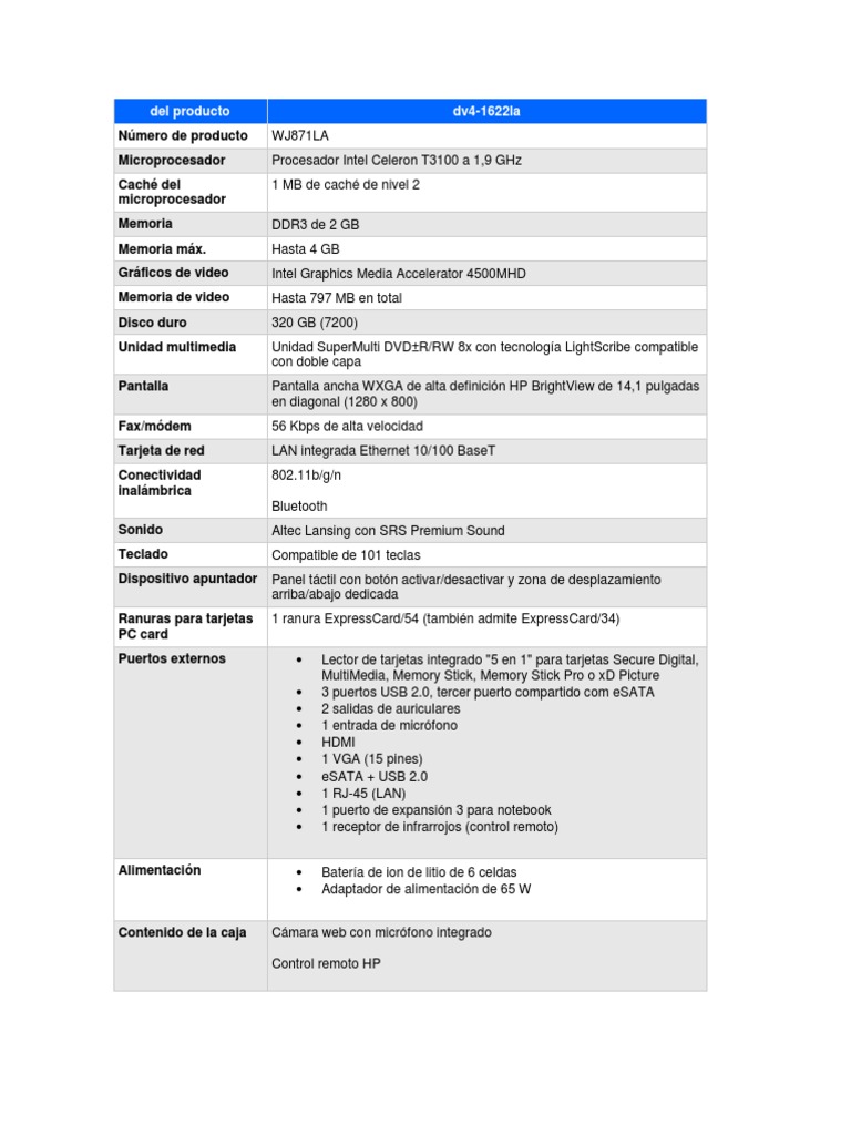 General Marca Modelo Tipo Procesador Capacidad de Procesador Memoria RAM (GB) Disco Duro (GB) Velocidad de Disco Duro (rpm) Unidades de Disco Tarjeta de Video Sistema Operativo Software Incluido Garanta Pantalla Tipo Tamao (pulgadas) Dimensiones CPU Alto (mm) Ancho (mm) Profundo (mm) Peso (kg) 34/40 334 240 2.42 LCD / Widescreen / HD 14.1 HP Pavilion DV4-1622 Laptop Intel Celeron T3100 1,90 GHz, 1 MB de cach de nivel 2, FSB de 800 MHz 2 320 7200 CD-DVDRW Super Multi, Slot 5-1 tarjetas de memoria Intel Graphics Media Accelerator 4500M (compartido) Windows 7 Home Premium original 64 bit Symantec Norton Internet Security 2010 versin de prueba por 60 das, HP Support Assistant/HP PC Re 1 Ao