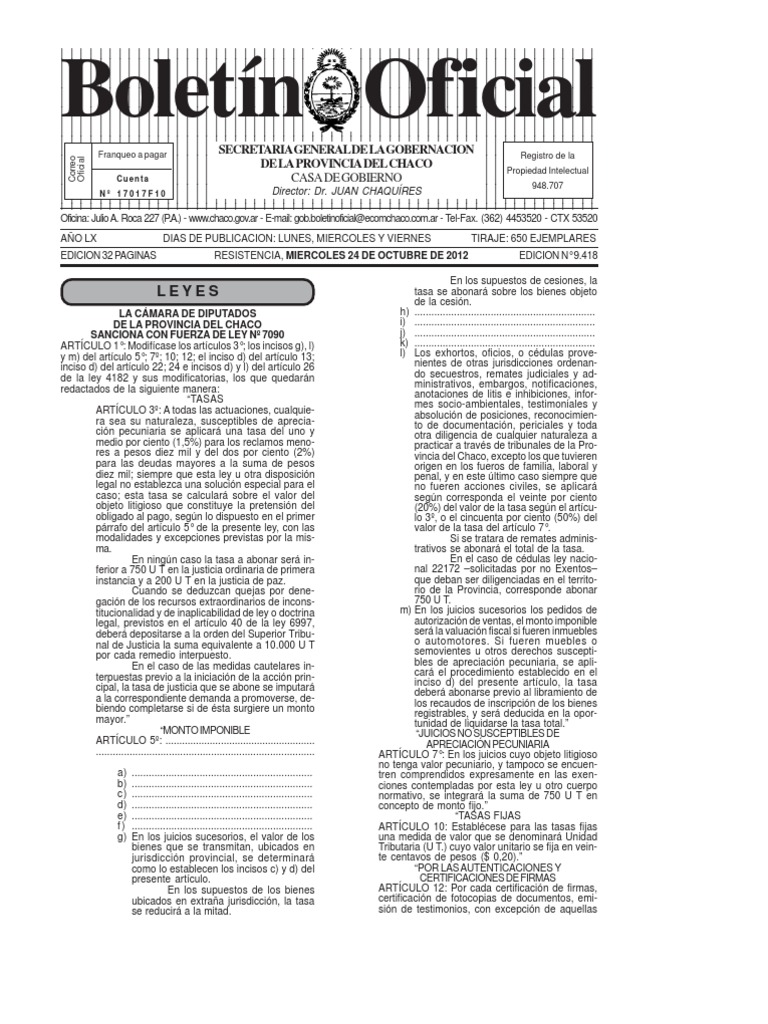 Oficina: Julio A. Roca 227 (P - www.chaco.gov.ar - E-mail: gob.boletinoficial@ecomchaco.com.ar - Tel-Fax. (362) 4453520 - CTX 53520 .A.) AO LX EDICION 32 PAGINAS DIAS DE PUBLICACION: LUNES, MIERCOLES Y VIERNES RESISTENCIA, MIERCOLES 24 DE OCTUBRE DE 2012 TIRAJE: 650 EJEMPLARES