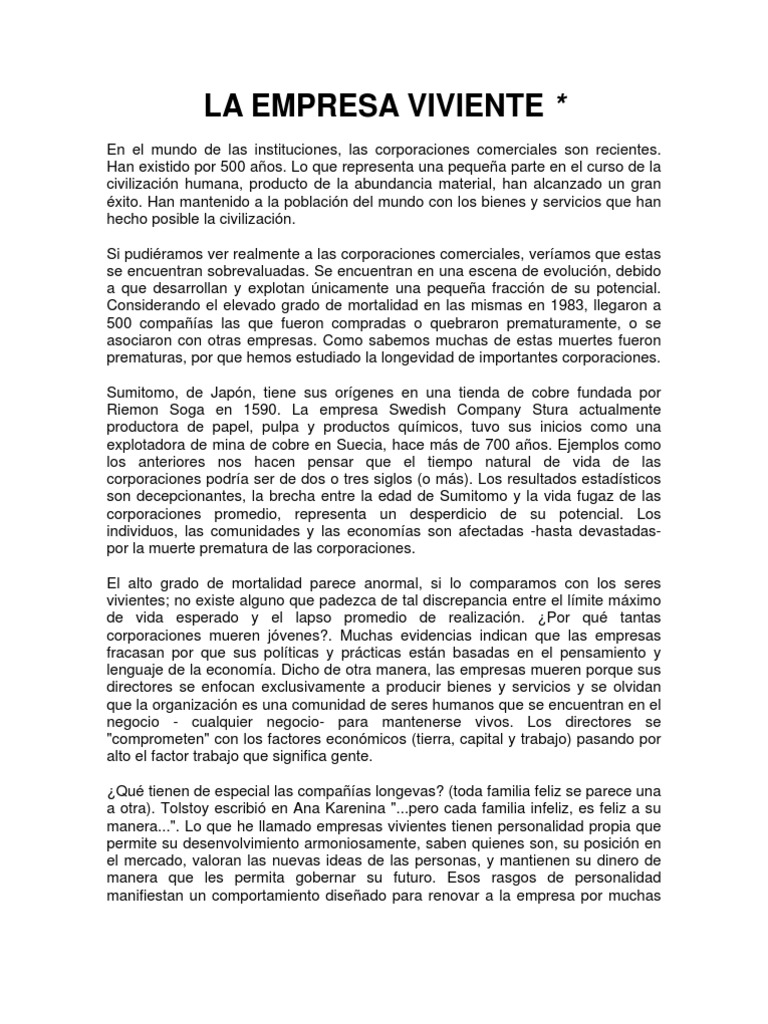 En el mundo de las instituciones, las corporaciones comerciales son recientes. Han existido por 500 aos. Lo que representa una pequea parte en el curso de la civilizacin humana, producto de la abundancia material, han alcanzado un gran xito. Han mantenido a la poblacin del mundo con los bienes y servicios que han hecho posible la civilizacin. Si pudiramos ver realmente a las corporaciones comerciales, veramos que estas se encuentran sobrevaluadas. Se encuentran en una escena de evolucin, debido a que desarrollan y explotan nicamente una pequea fraccin de su potencial. Considerando el elevado grado de mortalidad en las mismas en 1983, llegaron a 500 compaas las que fueron compradas o quebraron prematuramente, o se asociaron con otras empresas. Como sabemos muchas de estas muertes fueron prematuras, por que hemos estudiado la longevidad de importantes corporaciones. Sumitomo, de Japn, tiene sus orgenes en una tienda de cobre fundada por Riemon Soga en 1590. La empresa Swedish Company Stura actualmente productora de papel, pulpa y productos qumicos, tuvo sus inicios como una explotadora de mina de cobre en Suecia, hace ms de 700 aos. Ejemplos como los anteriores nos hacen pensar que el tiempo natural de vida de las corporaciones podra ser de dos o tres siglos (o ms). Los resultados estadsticos son decepcionantes, la brecha entre la edad de Sumitomo y la vida fugaz de las corporaciones promedio, representa un desperdicio de su potencial. Los individuos, las comunidades y las economas son afectadas -hasta devastadaspor la muerte prematura de las corporaciones. El alto grado de mortalidad parece anormal, si lo comparamos con los seres vivientes; no existe alguno que padezca de tal discrepancia entre el lmite mximo de vida esperado y el lapso promedio de realizacin. Por qu tantas corporaciones mueren jvenes?. Muchas evidencias indican que las empresas fracasan por que sus polticas y prcticas estn basadas en el pensamiento y lenguaje de la economa. Dicho de otra manera, las empresas mueren porque sus directores se enfocan exclusivamente a producir bienes y servicios y se olvidan que la organizacin es una comunidad de seres humanos que se encuentran en el negocio - cualquier negocio- para mantenerse vivos. Los directores se "comprometen" con los factores econmicos (tierra, capital y trabajo) pasando por alto el factor trabajo que significa gente. Qu tienen de especial las compaas longevas? (toda familia feliz se parece una a otra). Tolstoy escribi en Ana Karenina "...pero cada familia infeliz, es feliz a su manera...". Lo que he llamado empresas vivientes tienen personalidad propia que permite su desenvolvimiento armoniosamente, saben quienes son, su posicin en el mercado, valoran las nuevas ideas de las personas, y mantienen su dinero de manera que les permita gobernar su futuro. Esos rasgos de personalidad manifiestan un comportamiento diseado para renovar a la empresa por muchas