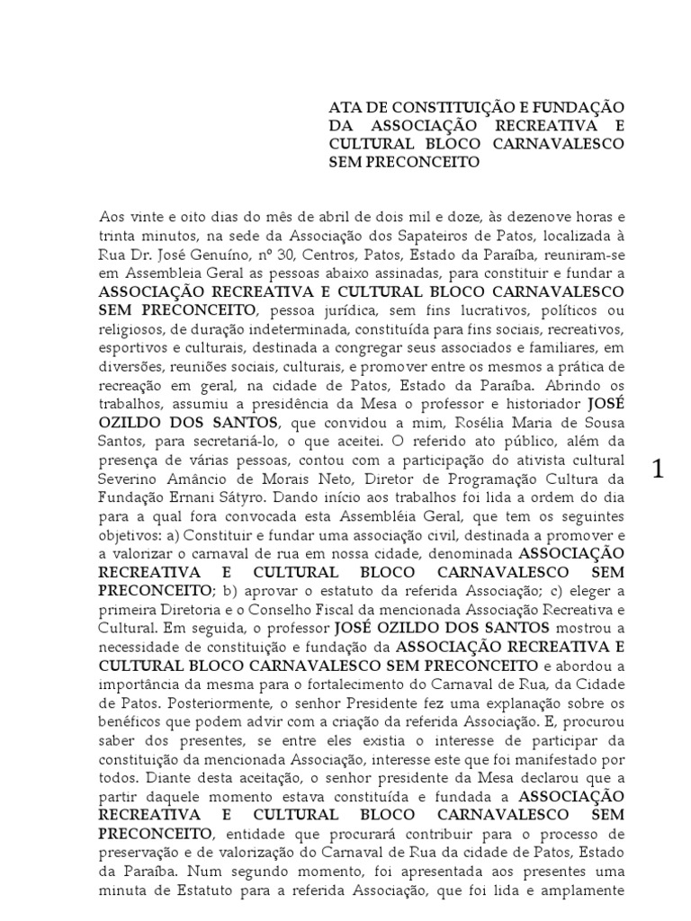 de dois mil e doze, s dezenove horas e trinta minutos, na sede da Associao dos Sapateiros de Patos, localizada Rua Dr. Jos Genuno, n 30, Centros, Patos, Estado da Paraba, reuniram-se em Assembleia Geral as pessoas abaixo assinadas, para constituir e fundar a ASSOCIAO RECREATIVA E CULTURAL BLOCO CARNAVALESCO SEM PRECONCEITO, pessoa jurdica, sem fins lucrativos, polticos ou religiosos, de durao indeterminada, constituda para fins sociais, recreativos, esportivos e culturais, destinada a congregar seus associados e familiares, em diverses, reunies sociais, culturais, e promover entre os mesmos a prtica de recreao em geral, na cidade de Patos, Estado da Paraba. Abrindo os trabalhos, assumiu a presidncia da Mesa o professor e historiador JOS OZILDO DOS SANTOS, que convidou a mim, Roslia Maria de Sousa Santos, para secretari-lo, o que aceitei. O referido ato pblico, alm da presena de vrias pessoas, contou com a participao do ativista cultural Severino Amncio de Morais Neto, Diretor de Programao Cultura da Fundao Ernani Styro. Dando incio aos trabalhos foi lida a ordem do dia para a qual fora convocada esta Assemblia Geral, que tem os seguintes objetivos: a) Constituir e fundar uma associao civil, destinada a promover e a valorizar o carnaval de rua em nossa cidade, denominada ASSOCIAO RECREATIVA E CULTURAL BLOCO CARNAVALESCO SEM PRECONCEITO; b) aprovar o estatuto da referida Associao; c) eleger a primeira Diretoria e o Conselho Fiscal da mencionada Associao Recreativa e Cultural. Em seguida, o professor JOS OZILDO DOS SANTOS mostrou a necessidade de constituio e fundao da ASSOCIAO RECREATIVA E CULTURAL BLOCO CARNAVALESCO SEM PRECONCEITO e abordou a importncia da mesma para o fortalecimento do Carnaval de Rua, da Cidade de Patos. Posteriormente, o senhor Presidente fez uma explanao sobre os benficos que podem advir com a criao da referida Associao. E, procurou saber dos presentes, se entre eles existia o interesse de participar da constituio da mencionada Associao, interesse este que foi manifestado por todos. Diante desta aceitao, o senhor presidente da Mesa declarou que a partir daquele momento estava constituda e fundada a ASSOCIAO RECREATIVA E CULTURAL BLOCO CARNAVALESCO SEM PRECONCEITO, entidade que procurar contribuir para o processo de preservao e de valorizao do Carnaval de Rua da cidade de Patos, Estado da Paraba. Num segundo momento, foi apresentada aos presentes uma minuta de Estatuto para a referida Associao, que foi lida e amplamente