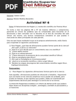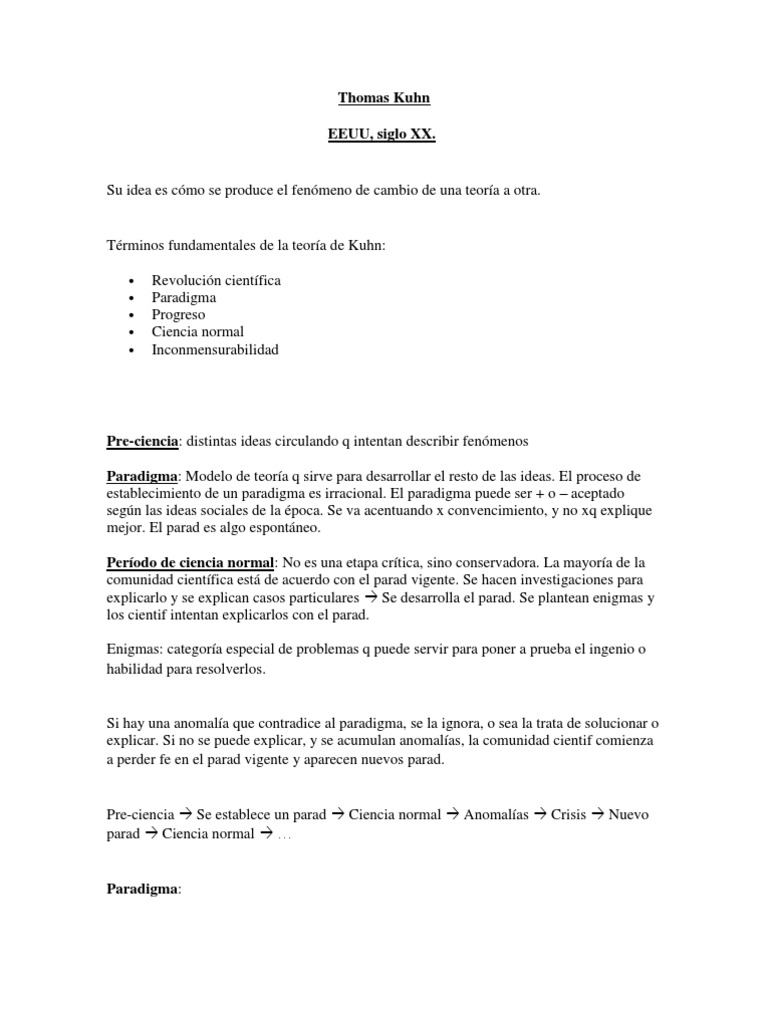 Pre-ciencia: distintas ideas circulando q intentan describir fenmenos Paradigma: Modelo de teora q sirve para desarrollar el resto de las ideas. El proceso de establecimiento de un paradigma es irracional. El paradigma puede ser + o aceptado segn las ideas sociales de la poca. Se va acentuando x convencimiento, y no xq explique mejor. El parad es algo espontneo. Perodo de ciencia normal: No es una etapa crtica, sino conservadora. La mayora de la comunidad cientfica est de acuerdo con el parad vigente. Se hacen investigaciones para explicarlo y se explican casos particulares Se desarrolla el parad. Se plantean enigmas y los cientif intentan explicarlos con el parad. Enigmas: categora especial de problemas q puede servir para poner a prueba el ingenio o habilidad para resolverlos.