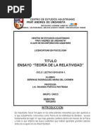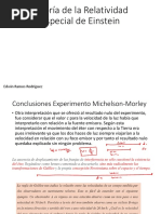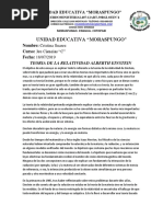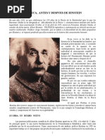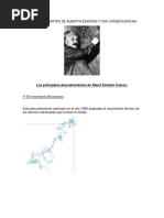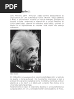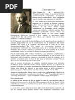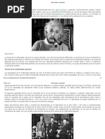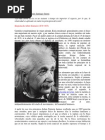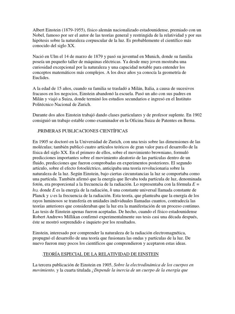 teoras general y restringida de la relatividad y por sus hiptesis sobre la naturaleza corpuscular de la luz. Es probablemente el cientfico ms conocido del siglo XX. Naci en Ulm el 14 de marzo de 1879 y pas su juventud en Munich, donde su familia posea un pequeo taller de mquinas elctricas. Ya desde muy joven mostraba una curiosidad excepcional por la naturaleza y una capacidad notable para entender los conceptos matemticos ms complejos. A los doce aos ya conoca la geometra de Euclides. A la edad de 15 aos, cuando su familia se traslad a Miln, Italia, a causa de sucesivos fracasos en los negocios, Einstein abandon la escuela. Pas un ao con sus padres en Miln y viaj a Suiza, donde termin los estudios secundarios e ingres en el Instituto Politcnico Nacional de Zurich. Durante dos aos Einstein trabaj dando clases particulares y de profesor suplente. En 1902 consigui un trabajo estable como examinador en la Oficina Suiza de Patentes en Berna. .PRIMERAS PUBLICACIONES CIENTFICAS En 1905 se doctor en la Universidad de Zurich, con una tesis sobre las dimensiones de las molculas; tambin public cuatro artculos tericos de gran valor para el desarrollo de la fsica del siglo XX. En el primero de ellos, sobre el movimiento browniano, formul predicciones importantes sobre el movimiento aleatorio de las partculas dentro de un fluido, predicciones que fueron comprobadas en experimentos posteriores. El segundo artculo, sobre el efecto fotoelctrico, anticipaba una teora revolucionaria sobre la naturaleza de la luz. Segn Einstein, bajo ciertas circunstancias la luz se comportaba como una partcula. Tambin afirm que la energa que llevaba toda partcula de luz, denominada fotn, era proporcional a la frecuencia de la radiacin. Lo representaba con la frmula E = h, donde E es la energa de la radiacin, h una constante universal llamada constante de Planck y es la frecuencia de la radiacin. Esta teora, que planteaba que la energa de los rayos luminosos se transfera en unidades individuales llamadas cuantos, contradeca las teoras anteriores que consideraban que la luz era la manifestacin de un proceso continuo. Las tesis de Einstein apenas fueron aceptadas. De hecho, cuando el fsico estadounidense Robert Andrews Millikan confirm experimentalmente sus tesis casi una dcada despus, ste se mostr sorprendido e inquieto por los resultados. Einstein, interesado por comprender la naturaleza de la radiacin electromagntica, propugn el desarrollo de una teora que fusionara las ondas y partculas de la luz. De nuevo fueron muy pocos los cientficos que comprendieron y aceptaron estas ideas. .TEORA ESPECIAL DE LA RELATIVIDAD DE EINSTEIN La tercera publicacin de Einstein en 1905, Sobre la electrodinmica de los cuerpos en movimiento, y la cuarta titulada Depende la inercia de un cuerpo de la energa que