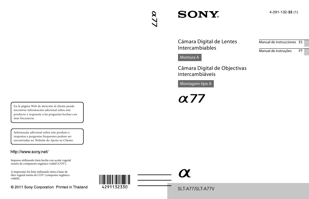 Nombre del producto: Cmara Digital Modelo: SLT-A77/A77V POR FAVOR LEA DETALLADAMENTE ESTE MANUAL DE INSTRUCCIONES ANTES DE CONECTAR Y OPERAR ESTE EQUIPO. RECUERDE QUE UN MAL USO DE SU APARATO PODRA ANULAR LA GARANTA.