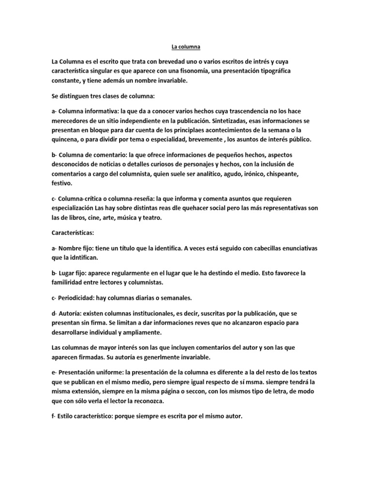 La Columna es el escrito que trata con brevedad uno o varios escritos de intrs y cuya caracterstica singular es que aparece con una fisonoma, una presentacin tipogrfica constante, y tiene adems un nombre invariable. Se distinguen tres clases de columna: a- Columna informativa: la que da a conocer varios hechos cuya trascendencia no los hace merecedores de un sitio independiente en la publicacin. Sintetizadas, esas informaciones se presentan en bloque para dar cuenta de los principlaes acontecimientos de la semana o la quincena, o para dividir por tema o especialidad, brevemente , los asuntos de inters pblico. b- Columna de comentario: la que ofrece informaciones de pequeos hechos, aspectos desconocidos de noticias o detalles curiosos de personajes y hechos, con la inclusin de comentarios a cargo del columnista, quien suele ser analtico, agudo, irnico, chispeante, festivo. c- Columna-crtica o columna-resea: la que informa y comenta asuntos que requieren especializacin Las hay sobre distintas reas dle quehacer social pero las ms representativas son las de libros, cine, arte, msica y teatro. Caractersticas: a- Nombre fijo: tiene un ttulo que la identifica. A veces est seguido con cabecillas enunciativas que la idntifican. b- Lugar fijo: aparece regularmente en el lugar que le ha destindo el medio. Esto favorece la familiridad entre lectores y columnistas. c- Periodicidad: hay columnas diarias o semanales. d- Autora: existen columnas institucionales, es decir, suscritas por la publicacin, que se presentan sin firma. Se limitan a dar informaciones reves que no alcanzaron espacio para desarrollarse individual y ampliamente. Las columnas de mayor inters son las que incluyen comentarios del autor y son las que aparecen firmadas. Su autora es generlmente invariable. e- Presentacin uniforme: la presentacin de la columna es diferente a la del resto de los textos que se publican en el mismo medio, pero siempre igual respecto de s msma. siempre tendr la misma extensin, siempre en la misma pgina o seccon, con los mismos tipo de letra, de modo que con slo verla el lector la reconozca. f- Estilo caracterstico: porque siempre es escrita por el mismo autor.