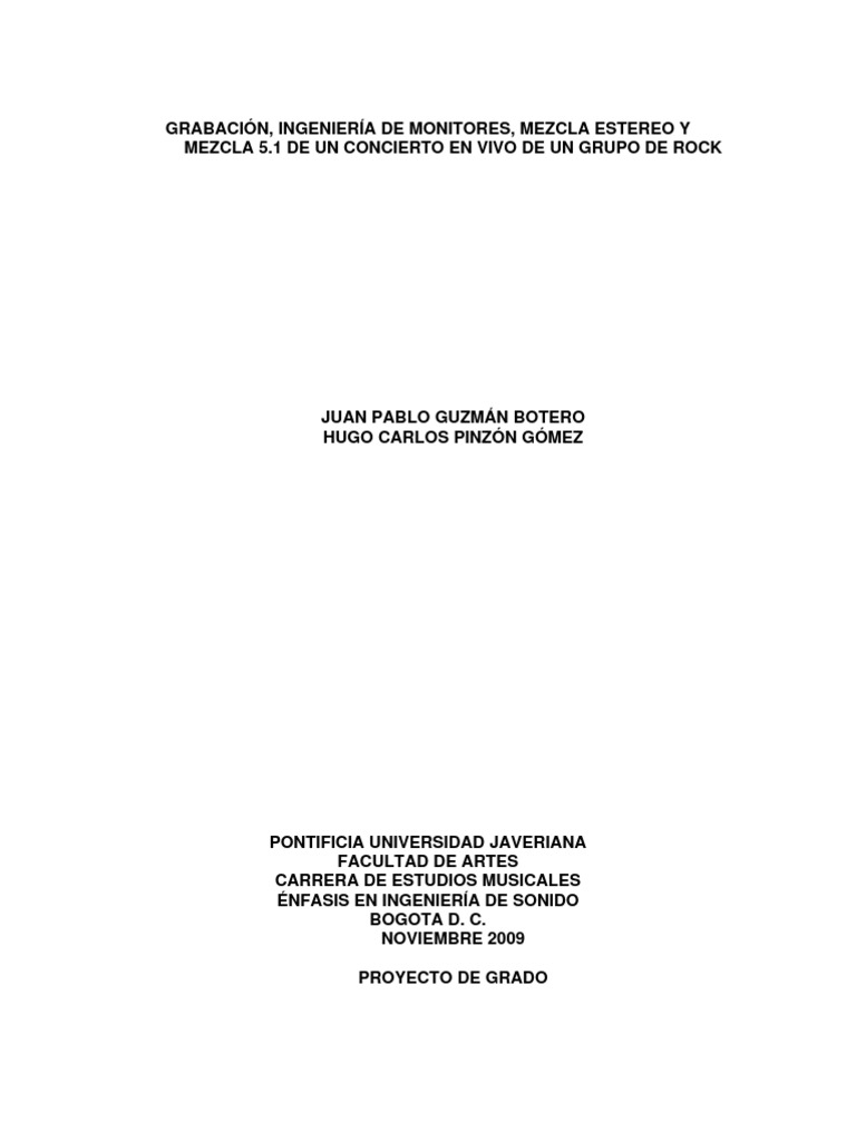 PONTIFICIA UNIVERSIDAD JAVERIANA FACULTAD DE ARTES CARRERA DE ESTUDIOS MUSICALES NFASIS EN INGENIERA DE SONIDO BOGOTA D. C. NOVIEMBRE 2009 PROYECTO DE GRADO