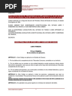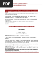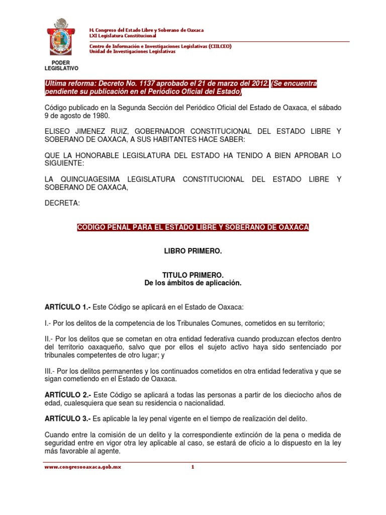 ltima reforma: Decreto No. 1137 aprobado el 21 de marzo del 2012. (Se encuentra pendiente su publicacin en el Peridico Oficial del Estado) Cdigo publicado en la Segunda Seccin del Peridico Oficial del Estado de Oaxaca, el sbado 9 de agosto de 1980. ELISEO JIMENEZ RUIZ, GOBERNADOR CONSTITUCIONAL DEL ESTADO LIBRE Y SOBERANO DE OAXACA, A SUS HABITANTES HACE SABER: QUE LA HONORABLE LEGISLATURA DEL ESTADO HA TENIDO A BIEN APROBAR LO SIGUIENTE: LA QUINCUAGESIMA LEGISLATURA SOBERANO DE OAXACA, DECRETA: CONSTITUCIONAL DEL ESTADO LIBRE Y