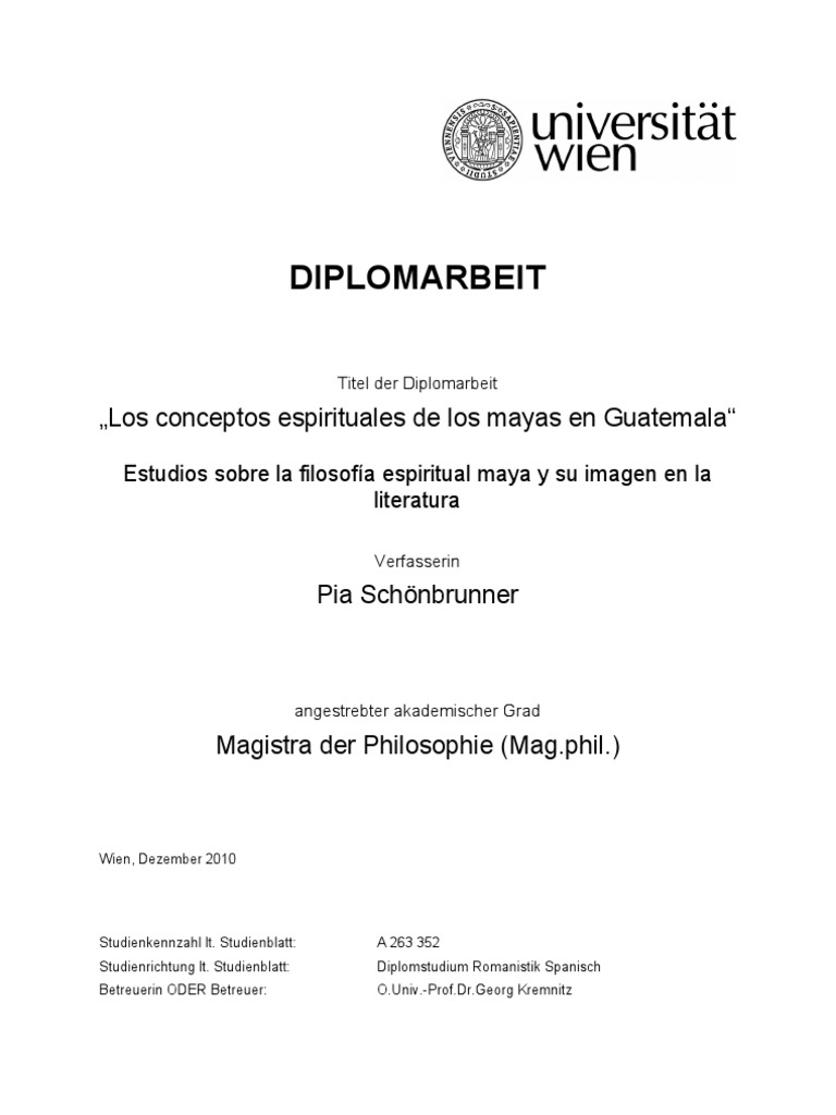Um diese Arbeit verfassen zu knnen, war es wichtig eine Feldforschungsstudie ber die Spiritualitt der Maya in Guatemala durchzufhren, um die Tradition so darstellen zu knnen, wie sie heute praktiziert wird. Im Laufe meiner Recherchen und besonders im Zuge der Interviewreihe, wurde der Unterschied zwischen dem Bild, das in aktuellen archologischen und anthropologischen Abhandlungen prsentiert wird und dem Selbstbild der Indigenen, welche die spirituellen Traditionen aufrechterhalten immer deutlicher. Meine Interviewpartner lehnten Interpretationen ihrer Kultur und ins Besondere der Spiritualitt, wie sie oft in der Literatur prsentiert werden ab und wiesen darauf hin, dass solche Fehlinterpretationen das Ergebnis einer Betrachtung von auen, also vom Standpunkt der westlichen Kultur sei. Die Philosophie der Spiritualitt der Maya ist ein sehr tiefgrndiges Konzept und lsst sich nur durch eingehendes Studium dieser Kultur und ihrem Weltverstndnis verstehen. Um einen Einblick in aktuelle Studien ber die Maya zu geben, gehe ich im ersten Teil meiner Arbeit auf die archologische Forschung und deren Erkenntnisse im Bezug auf die Geschichte der Maya ein. Hier zeigt sich, dass die verschiedenen Studien im Bezug auf die Entstehung der Maya Kultur und besonders im Bezug auf Einflsse anderer Kulturen uneins sind, und viele Fragen offen bleiben. Ein mglicher Einfluss kriegerischer Kulturen besonders am Beginn der so genannten Klassischen Periode, die als Bltezeit der Maya angesehen wird und die Tatsache, dass die Bltezeit der Maya mglicherweise schon lange vor der Klassischen Periode anzusetzen wre, erklren , warum viele meiner Interviewpartner die Klassischen Periode und deren Beschreibung in der Literatur nicht als ein falsches Bild der Maya und ihrer kulturellen Traditionen ansehen. Im zweiten Teil meiner Arbeit gehe ich auf die spirituellen Konzepte der Maya oder deren Nachfahren heute genauer ein. Man versichert mir, dass ein richtiges Verstndnis der Spiritualitt der Maya nur in der Praxis und der Ausbung der Spiritualitt erlangt werden kann. Die spirituelle Welt der Maya kann nicht getrennt von deren Alltag und deren Weltanschauung betrachtet werden. Spirituelle Konzepte sind so sehr in der Auffassung von Realitt begrndet, dass es berechtigt scheint, wenn Shamanen mir versichern, dass nur wer diese Spiritualitt lebt, sie auch versteht. Die Basis der spirituellen Weltanschauung der Maya ist die Verbindung mit dem Kosmos in Harmonie und Gleichgewicht. Das Handeln des Menschen muss dieses Gleichgewicht mit dem Kosmos zum Ziel haben. Im Weiteren gilt das Prinzip der Energie. Alles was existiert ist Energie und Teil eines Ganzen, desselben energetischen Ursprungs. Dieses Bewusstsein ber die Energie von allem, was existiert fhrt zu der