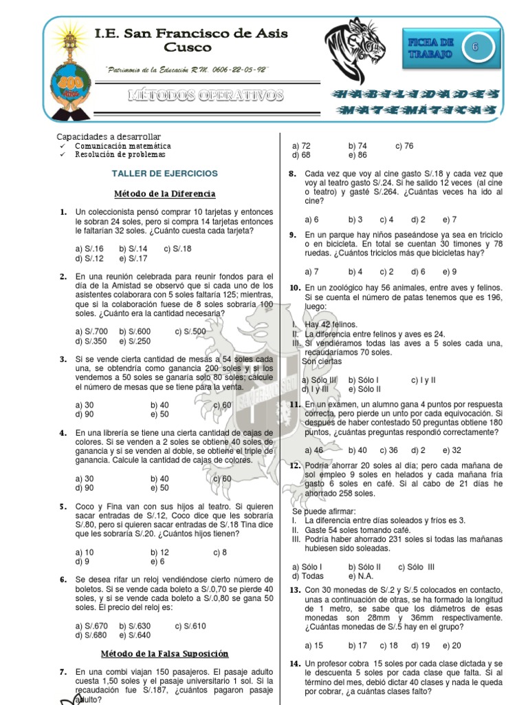 S/.30, luego pierde Tania y tiene que duplicarse el dinero a Pablo, quedando de esta manera Pablo con 80 soles y Tania con 40 soles. Cunto tena Pablo inicialmente? a) S/.50 d) S/.80 b) S/.65 e) S/.70 c) S/.110