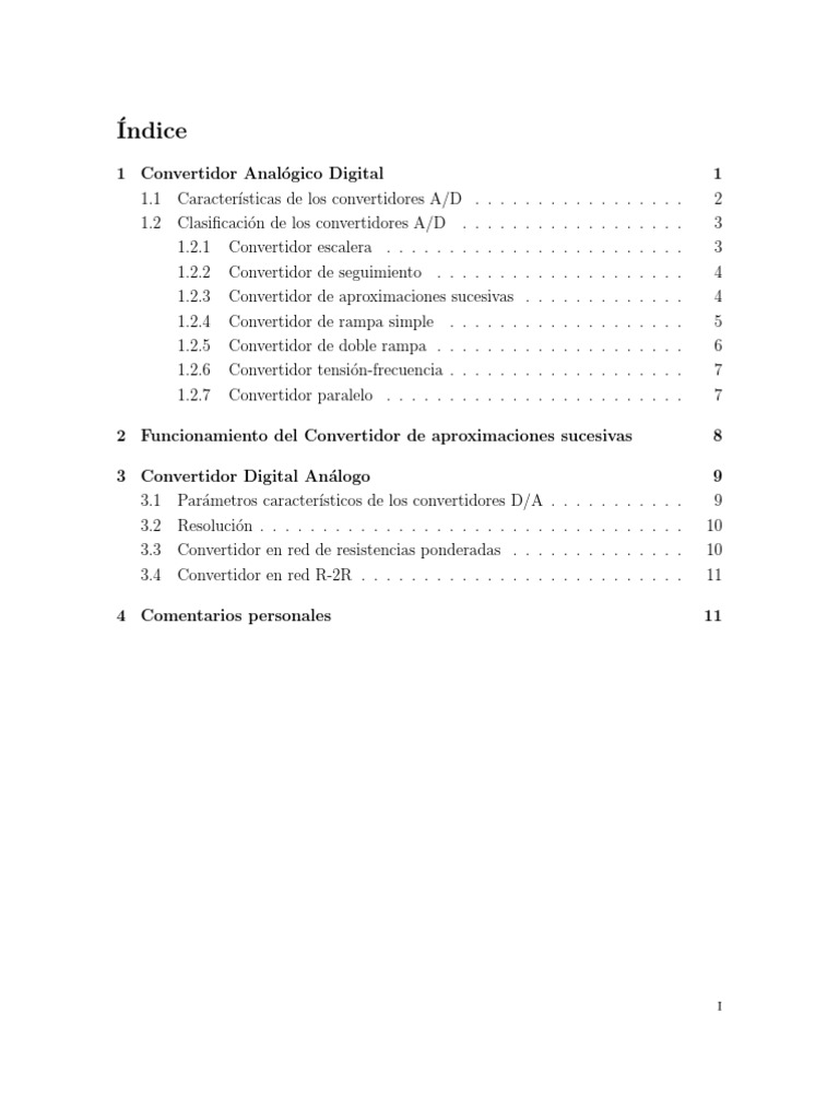 2 Funcionamiento del Convertidor de aproximaciones sucesivas 3 Convertidor Digital Anlogo a 3.1 Parmetros caracter a sticos de los convertidores 3.2 Resolucin . . . . . . . . . . . . . . . . . . . . o 3.3 Convertidor en red de resistencias ponderadas 3.4 Convertidor en red R-2R . . . . . . . . . . . . 4 Comentarios personales