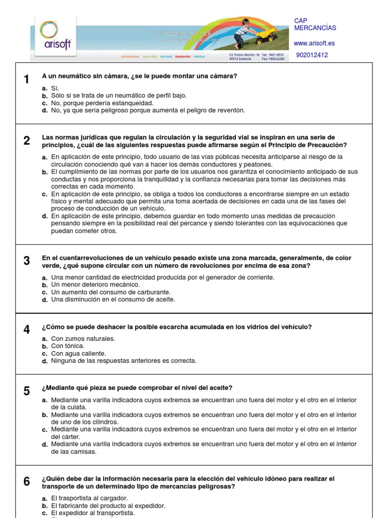 Al conductor de un vehculo que transporta mercanca peligrosa se le deben entregar unas instrucciones escritas en las que se indique, entre otros datos... a. b. c. d. La ruta que debe seguir y las restricciones de circulacin. Las acciones para en caso de accidente. La ubicacin exacta de los medios de extincin de incendios. Las indicaciones especiales para la descarga.