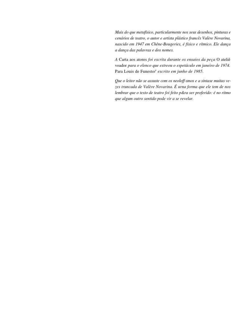 Novarina, nascido em 1947 em Chne-Bougeries, fsico e rtmico. Ele dana a dana das palavras e dos nomes. A Carta aos atores foi escrita durante os ensaios da pea O ateli voador para o elenco que estreou o espetculo em janeiro de 1974. Para Louis de Funesto/' escrito em junho de 1985. Que o leitor no se assuste com os neoloff-smos e a sintaxe muitas vezes truncada de Valre Novarina. urna forma que ele tem de nos lembrar que o texto de teatro foi feito p&ra ser proferido: no ritmo que algum outro sentido pode vir a se revelar.