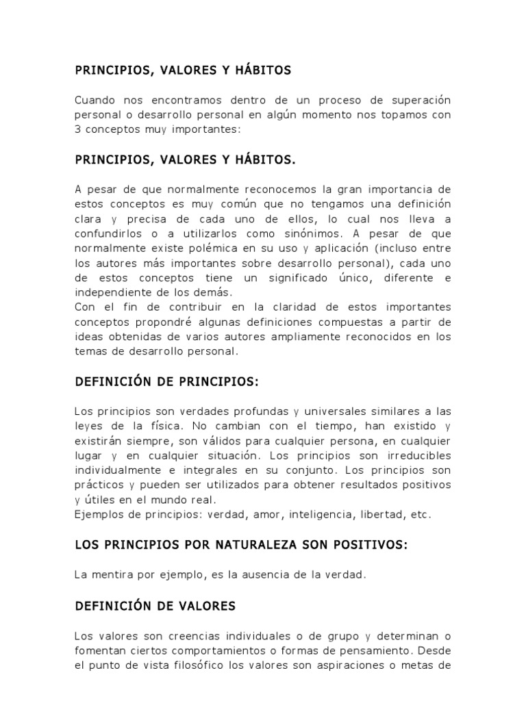 Los principios son verdades profundas y universales similares a las leyes de la fsica. No cambian con el tiempo, han existido y existirn siempre, son vlidos para cualquier persona, en cualquier lugar y en cualquier situacin. Los principios son irreducibles individualmente e integrales en su conjunto. Los principios son prcticos y pueden ser utilizados para obtener resultados positivos y tiles en el mundo real. Ejemplos de principios: verdad, amor, inteligencia, libertad, etc.