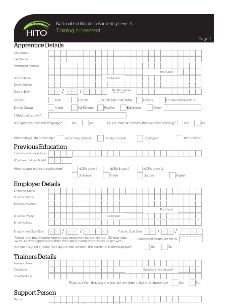 THIS TRAINING AGREEMENT IS IN THE BARBERING INDUSTRY. 1.1 The provisions of the NZ Hairdressing Industry Training Organisation Training Requirements dated 1 January 2010 and any amendments to those Requirements (Training Requirements) are incorporated into and form part of this Training Agreement (Agreement). TERM 2.1 This Agreement will commence on the date this Agreement is signed by both the Trainee and Employer (Parties) and end on the date the Trainee gains their relevant qualification unless terminated in accordance with Clause 5.3 or Clause 5.4 (Term). APPRENTICE OBLIGATIONS 3.1 The Apprentice shall, to the best of her/his ability, learn the skills of the industry as set down in the Training Requirements, and in particular, shall be responsible for: a. b. Taking all reasonable steps to acquire the knowledge and skills of the industry. Enrolling for assessments and attending all off-job training as directed. A fee will be charged for missed off-job training days if the absence was due to the actions of the Trainee and no reasonable explanation is provided to HITO. Keeping an up to date training record book in good order at the place of employment. Ensuring that units are completed in the year that they are delivered. Ensuring a minimum of twenty (20) credits are achieved per year. Working a minimum of twenty (20) hours per week or thirty (30) hours per week if the apprentice is a Modern Apprentice. Paying the required fees to HITO by the due date. 5.2 The term of the employment agreement of which this Agreement forms a part shall be no less than the Term of this Agreement. 5.3 This Agreement may be terminated in accordance with the provisions of the employment agreement between the Parties. Termination of the employment agreement will automatically result in termination of this Agreement. 5.4 This Agreement may be terminated by HITO, by providing 4 weeks written notice: a. b. c. if the Apprentice does not achieve a minimum of twenty (20) credits per year of the Term; or upon non-payment of the fees specified in this Agreement payable by the Apprentice or the Employer; or where HITO does not receive sufficient funding to support continued training of the Apprentice.