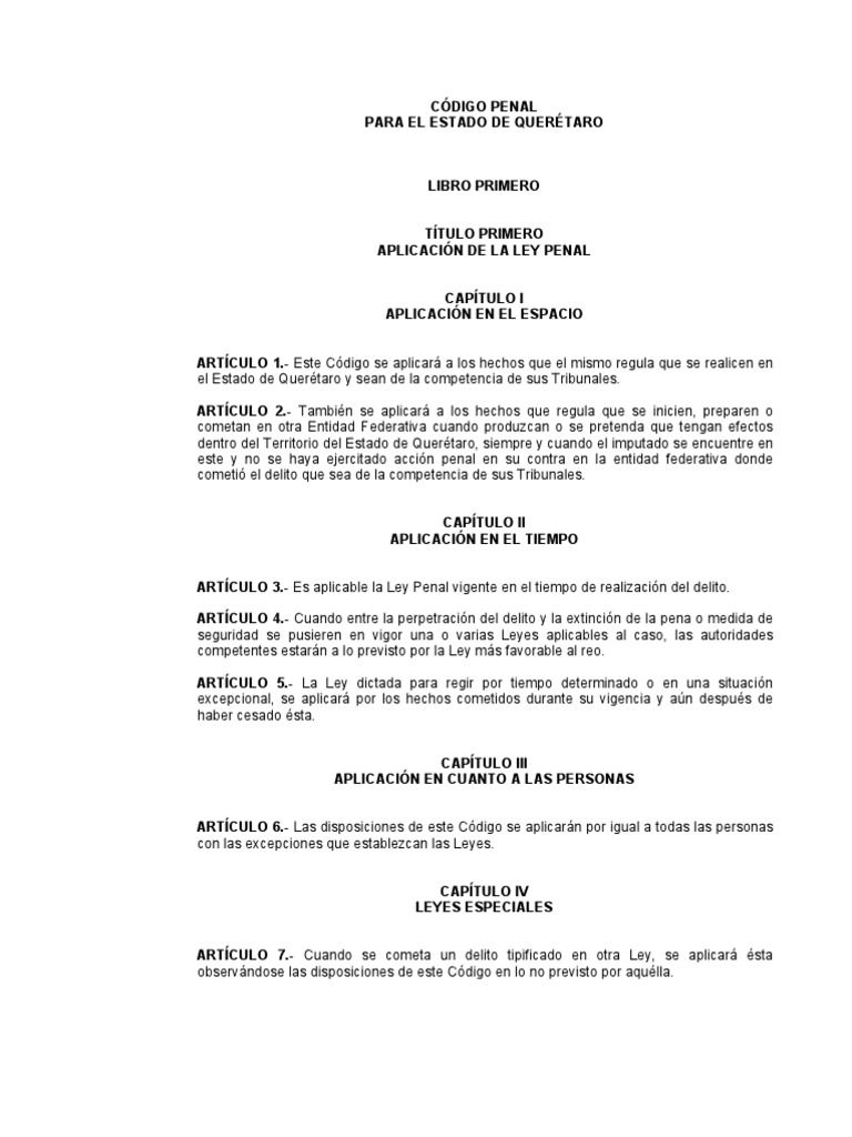 LIBRO PRIMERO TTULO PRIMERO APLICACIN DE LA LEY PENAL CAPTULO I APLICACIN EN EL ESPACIO ARTCULO 1.- Este Cdigo se aplicar a los hechos que el mismo regula que se realicen en el Estado de Quertaro y sean de la competencia de sus Tribunales. ARTCULO 2.- Tambin se aplicar a los hechos que regula que se inicien, preparen o cometan en otra Entidad Federativa cuando produzcan o se pretenda que tengan efectos dentro del Territorio del Estado de Quertaro, siempre y cuando el imputado se encuentre en este y no se haya ejercitado accin penal en su contra en la entidad federativa donde cometi el delito que sea de la competencia de sus Tribunales. CAPTULO II APLICACIN EN EL TIEMPO ARTCULO 3.- Es aplicable la Ley Penal vigente en el tiempo de realizacin del delito. ARTCULO 4.- Cuando entre la perpetracin del delito y la extincin de la pena o medida de seguridad se pusieren en vigor una o varias Leyes aplicables al caso, las autoridades competentes estarn a lo previsto por la Ley ms favorable al reo. ARTCULO 5.- La Ley dictada para regir por tiempo determinado o en una situacin excepcional, se aplicar por los hechos cometidos durante su vigencia y an despus de haber cesado sta. CAPTULO III APLICACIN EN CUANTO A LAS PERSONAS ARTCULO 6.- Las disposiciones de este Cdigo se aplicarn por igual a todas las personas con las excepciones que establezcan las Leyes. CAPTULO IV LEYES ESPECIALES ARTCULO 7.- Cuando se cometa un delito tipificado en otra Ley, se aplicar sta observndose las disposiciones de este Cdigo en lo no previsto por aqulla.