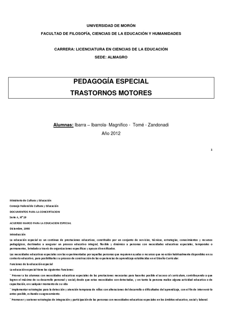 Ministerio de Cultura y Educacin Consejo Federal de Cultura y Educacin DOCUMENTOS PARA LA CONCERTACION Serie A, N 19 ACUERDO MARCO PARA LA EDUCACION ESPECIAL Diciembre, 1998 Introduccin La educacin especial es un continuo de prestaciones educativas, constituido por un conjunto de servicios, tcnicas, estrategias, conocimientos y recursos pedaggicos, destinados a asegurar un proceso educativo integral, flexible y dinmico a personas con necesidades educativas especiales, temporales o permanentes, brindado a travs de organizaciones especficas y apoyos diversificados. Las necesidades educativas especiales son las experimentadas por aquellas personas que requieren ayudas o recursos que no estn habitualmente disponibles en su contexto educativo, para posibilitarles su proceso de construccin de las experiencias de aprendizaje establecidas en el Diseo Curricular. Funciones de la educacin especial La educacin especial tiene las siguientes funciones: Proveer a los alumnos con necesidades educativas especiales de las prestaciones necesarias para hacerles posible el acceso al curriculum, contribuyendo a que logren el mximo de su desarrollo personal y social; desde que estas necesidades son detectadas, y en tanto la persona realice alguna actividad educativa o de capacitacin, en cualquier momento de su vida Implementar estrategias para la deteccin y atencin temprana de nios con alteraciones del desarrollo o dificultades del aprendizaje, con el fin de intervenir lo antes posible, evitando su agravamiento. Promover y sostener estrategias de integracin y participacin de las personas con necesidades educativas especiales en los mbitos educativo, social y laboral.