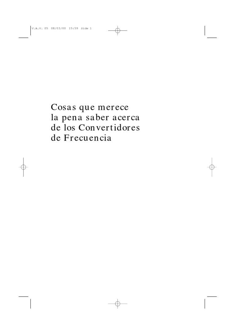 Desde 1968, Danfoss fabrica y comercializa Convertidores de Frecuencia VLT capaces de establecer el control sobre motores de corriente alterna trifsica. Los convertidores de frecuencia actuales son muy diferentes de las unidades que se fabricaban la pasada generacin, ya que contienen microprocesadores y circuitos integrados para el control y estn completamente digitalizados, lo cual los hace ms adaptables y fciles de poner en marcha y utilizar. Por lo tanto, aunque la estructura bsica de los convertidores de frecuencia no ha cambiado, ya era el momento de publicar una nueva edicin de Cosas que merece la pena saber acerca de los Convertidores de Frecuencia. Este libro presenta una breve introduccin de los convertidores de frecuencia para que los usuarios se familiaricen con sus ventajas, funciones, instalacin y funcionamiento. No se precisan conocimientos tcnicos especficos: para comprender los convertidores de frecuencia slo hacen falta una base terica de electrnica y matemticas y conocimientos prcticos sobre motores de CA. La primera parte de este libro presenta una descripcin terica de los motores de CA. La segunda parte analiza los principios que se utilizan como base para fabricar y controlar convertidores de frecuencia. La tercera parte describe el comportamiento de los motores cuando los controlan convertidores de frecuencia. Y la cuarta parte del libro resume cmo se ven afectados el motor y el entorno y cmo se protege el equipo y al personal, as como qu criterios se utilizan para seleccionar un convertidor de frecuencia. Por el modo en que est escrito, Cosas que merece la pena saber acerca de los convertidores de frecuencia resulta til para todo tipo de personas. Si desea ms informacin, no dude en ponerse en contacto con nosotros. Danfoss 2000