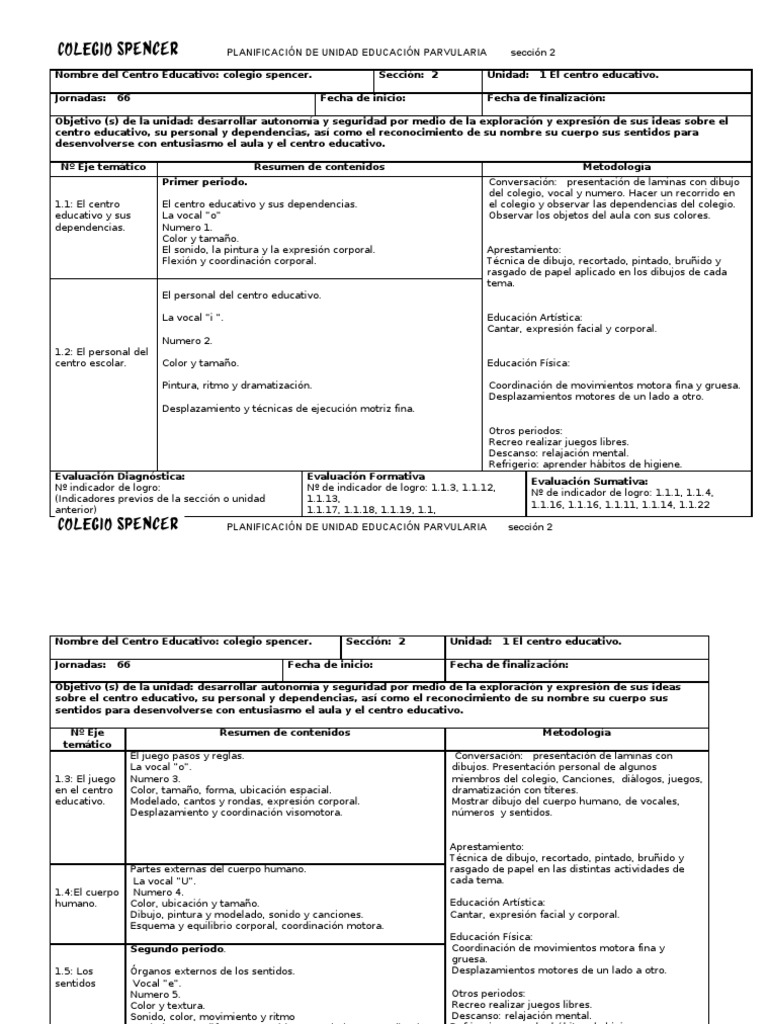 PLANIFICACIN DE UNIDAD EDUCACIN PARVULARIA Nombre del Centro Educativo: colegio spencer.