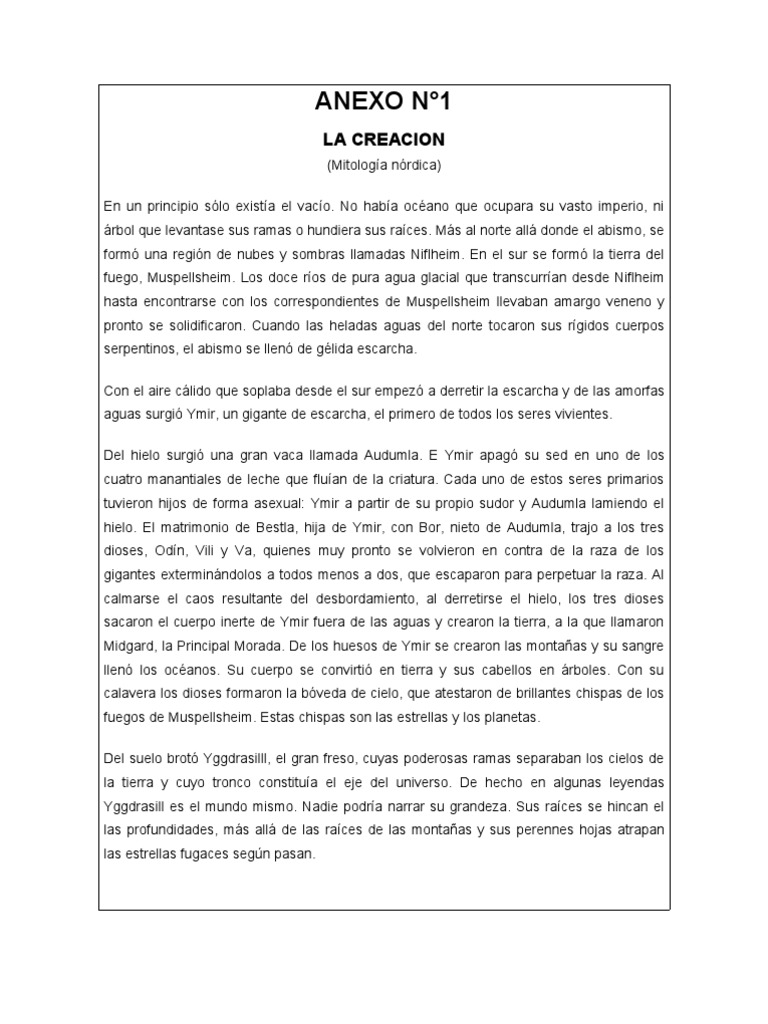 (Mitologa nrdica) En un principio slo exista el vaco. No haba ocano que ocupara su vasto imperio, ni rbol que levantase sus ramas o hundiera sus races. Ms al norte all donde el abismo, se form una regin de nubes y sombras llamadas Niflheim. En el sur se form la tierra del fuego, Muspellsheim. Los doce ros de pura agua glacial que transcurran desde Niflheim hasta encontrarse con los correspondientes de Muspellsheim llevaban amargo veneno y pronto se solidificaron. Cuando las heladas aguas del norte tocaron sus rgidos cuerpos serpentinos, el abismo se llen de glida escarcha. Con el aire clido que soplaba desde el sur empez a derretir la escarcha y de las amorfas aguas surgi Ymir, un gigante de escarcha, el primero de todos los seres vivientes. Del hielo surgi una gran vaca llamada Audumla. E Ymir apag su sed en uno de los cuatro manantiales de leche que fluan de la criatura. Cada uno de estos seres primarios tuvieron hijos de forma asexual: Ymir a partir de su propio sudor y Audumla lamiendo el hielo. El matrimonio de Bestla, hija de Ymir, con Bor, nieto de Audumla, trajo a los tres dioses, Odn, Vili y Va, quienes muy pronto se volvieron en contra de la raza de los gigantes exterminndolos a todos menos a dos, que escaparon para perpetuar la raza. Al calmarse el caos resultante del desbordamiento, al derretirse el hielo, los tres dioses sacaron el cuerpo inerte de Ymir fuera de las aguas y crearon la tierra, a la que llamaron Midgard, la Principal Morada. De los huesos de Ymir se crearon las montaas y su sangre llen los ocanos. Su cuerpo se convirti en tierra y sus cabellos en rboles. Con su calavera los dioses formaron la bveda de cielo, que atestaron de brillantes chispas de los fuegos de Muspellsheim. Estas chispas son las estrellas y los planetas. Del suelo brot Yggdrasilll, el gran freso, cuyas poderosas ramas separaban los cielos de la tierra y cuyo tronco constitua el eje del universo. De hecho en algunas leyendas Yggdrasill es el mundo mismo. Nadie podra narrar su grandeza. Sus races se hincan el las profundidades, ms all de las races de las montaas y sus perennes hojas atrapan las estrellas fugaces segn pasan.
