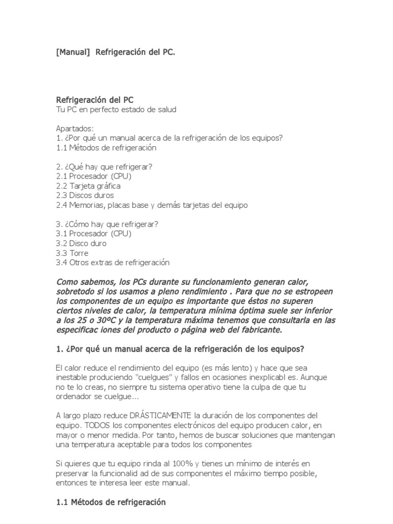 1. Por qu un manual acerca de la refrigeracin de los equipos? El calor reduce el rendimiento del equipo (es ms lento) y hace que sea inestable produciendo "cuelgues" y fallos en ocasiones inexplicabl es. Aunque no te lo creas, no siempre tu sistema operativo tiene la culpa de que tu ordenador se cuelgue... A largo plazo reduce DRSTICAMENTE la duracin de los componentes del equipo. TODOS los componentes electrnicos del equipo producen calor, en mayor o menor medida. Por tanto, hemos de buscar soluciones que mantengan una temperatura aceptable para todos los componentes Si quieres que tu equipo rinda al 100% y tienes un mnimo de inters en preservar la funcionalid ad de sus componentes el mximo tiempo posible, entonces te interesa leer este manual. 1.1 Mtodos de refrigeracin