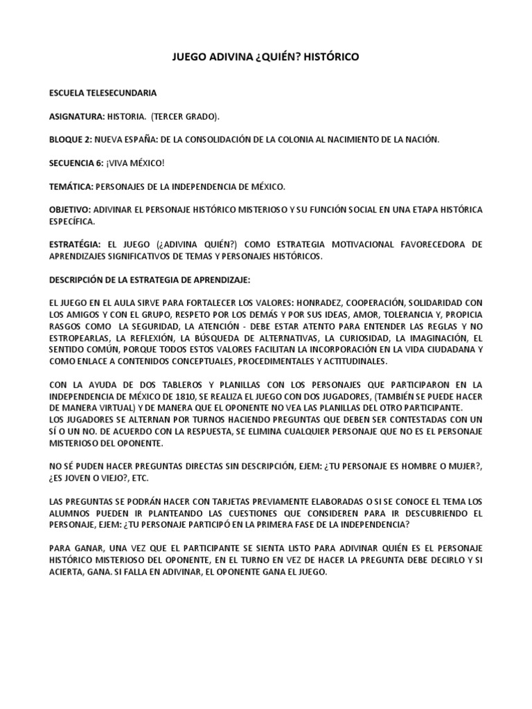 ESCUELA TELESECUNDARIA ASIGNATURA: HISTORIA. (TERCER GRADO). BLOQUE 2: NUEVA ESPAA: DE LA CONSOLIDACIN DE LA COLONIA AL NACIMIENTO DE LA NACIN. SECUENCIA 6: VIVA MXICO! TEMTICA: PERSONAJES DE LA INDEPENDENCIA DE MXICO. OBJETIVO: ADIVINAR EL PERSONAJE HISTRICO MISTERIOSO Y SU FUNCIN SOCIAL EN UNA ETAPA HISTRICA ESPECFICA. ESTRATGIA: EL JUEGO (ADIVINA QUIN?) COMO ESTRATEGIA MOTIVACIONAL FAVORECEDORA DE APRENDIZAJES SIGNIFICATIVOS DE TEMAS Y PERSONAJES HISTRICOS. DESCRIPCIN DE LA ESTRATEGIA DE APRENDIZAJE: EL JUEGO EN EL AULA SIRVE PARA FORTALECER LOS VALORES: HONRADEZ, COOPERACIN, SOLIDARIDAD CON LOS AMIGOS Y CON EL GRUPO, RESPETO POR LOS DEMS Y POR SUS IDEAS, AMOR, TOLERANCIA Y, PROPICIA RASGOS COMO LA SEGURIDAD, LA ATENCIN - DEBE ESTAR ATENTO PARA ENTENDER LAS REGLAS Y NO ESTROPEARLAS, LA REFLEXIN, LA BSQUEDA DE ALTERNATIVAS, LA CURIOSIDAD, LA IMAGINACIN, EL SENTIDO COMN, PORQUE TODOS ESTOS VALORES FACILITAN LA INCORPORACIN EN LA VIDA CIUDADANA Y COMO ENLACE A CONTENIDOS CONCEPTUALES, PROCEDIMENTALES Y ACTITUDINALES. CON LA AYUDA DE DOS TABLEROS Y PLANILLAS CON LOS PERSONAJES QUE PARTICIPARON EN LA INDEPENDENCIA DE MXICO DE 1810, SE REALIZA EL JUEGO CON DOS JUGADORES, (TAMBIN SE PUEDE HACER DE MANERA VIRTUAL) Y DE MANERA QUE EL OPONENTE NO VEA LAS PLANILLAS DEL OTRO PARTICIPANTE. LOS JUGADORES SE ALTERNAN POR TURNOS HACIENDO PREGUNTAS QUE DEBEN SER CONTESTADAS CON UN S O UN NO. DE ACUERDO CON LA RESPUESTA, SE ELIMINA CUALQUIER PERSONAJE QUE NO ES EL PERSONAJE MISTERIOSO DEL OPONENTE. NO S PUDEN HACER PREGUNTAS DIRECTAS SIN DESCRIPCIN, EJEM: TU PERSONAJE ES HOMBRE O MUJER?, ES JOVEN O VIEJO?, ETC. LAS PREGUNTAS SE PODRN HACER CON TARJETAS PREVIAMENTE ELABORADAS O SI SE CONOCE EL TEMA LOS ALUMNOS PUEDEN IR PLANTEANDO LAS CUESTIONES QUE CONSIDEREN PARA IR DESCUBRIENDO EL PERSONAJE, EJEM: TU PERSONAJE PARTICIP EN LA PRIMERA FASE DE LA INDEPENDENCIA? PARA GANAR, UNA VEZ QUE EL PARTICIPANTE SE SIENTA LISTO PARA ADIVINAR QUIN ES EL PERSONAJE HISTRICO MISTERIOSO DEL OPONENTE, EN EL TURNO EN VEZ DE HACER LA PREGUNTA DEBE DECIRLO Y SI ACIERTA, GANA. SI FALLA EN ADIVINAR, EL OPONENTE GANA EL JUEGO.