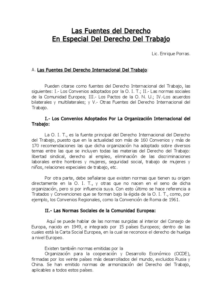 Lic. Enrique Porras. A. Las Fuentes Del Derecho Internacional Del Trabajo: Pueden citarse como fuentes del Derecho Internacional del Trabajo, las siguientes: I.- Los Convenios adoptados por la O. I. T.; II.- Las normas sociales de la Comunidad Europea; III.- Los Pactos de la O. N. U.; IV.-Los acuerdos bilaterales y multilaterales; y V.- Otras Fuentes del Derecho Internacional del Trabajo. I.- Los Convenios Adoptados Por La Organización Internacional del Trabajo: La O. I. T., es la fuente principal del Derecho Internacional del Derecho del Trabajo, puesto que en la actualidad son más de 160 Convenios y más de 170 recomendaciones las que dicha organización ha adoptado sobre diversos temas entre las que se incluyen todas las materias del Derecho del Trabajo: libertad sindical, derecho al empleo, eliminación de las discriminaciones laborales entre hombres y mujeres, seguridad social, trabajo de mujeres y niños, relaciones especiales de trabajo, etc. Por otra parte, debe señalarse que existen normas que tienen su origen directamente en la O. I. T., y otras que no nacen en el seno de dicha organización, pero si por influencia suya. Con esto último se hace referencia a Tratados y Convenciones que se forman bajo la égida de la O. I. T., como, por ejemplo, los Convenios Regionales, como la Convención de Roma de 1961. II.- Las Normas Sociales de la Comunidad Europea: Aquí se puede hablar de las normas surgidas al interior del Consejo de Europa, nacido en 1949, e integrado por 15 países Europeos; dentro de las cuales está la Carta Social Europea, en la cual se reconoce el derecho de huelga a nivel Europeo. Existen también normas emitidas por la Organización para la cooperación y Desarrollo Económico (OCDE), firmadas por los veinte países más desarrollados del mundo, excluidos Rusia y China. Se han emitido normas de armonización del Derecho del Trabajo, aplicables a todos estos países.